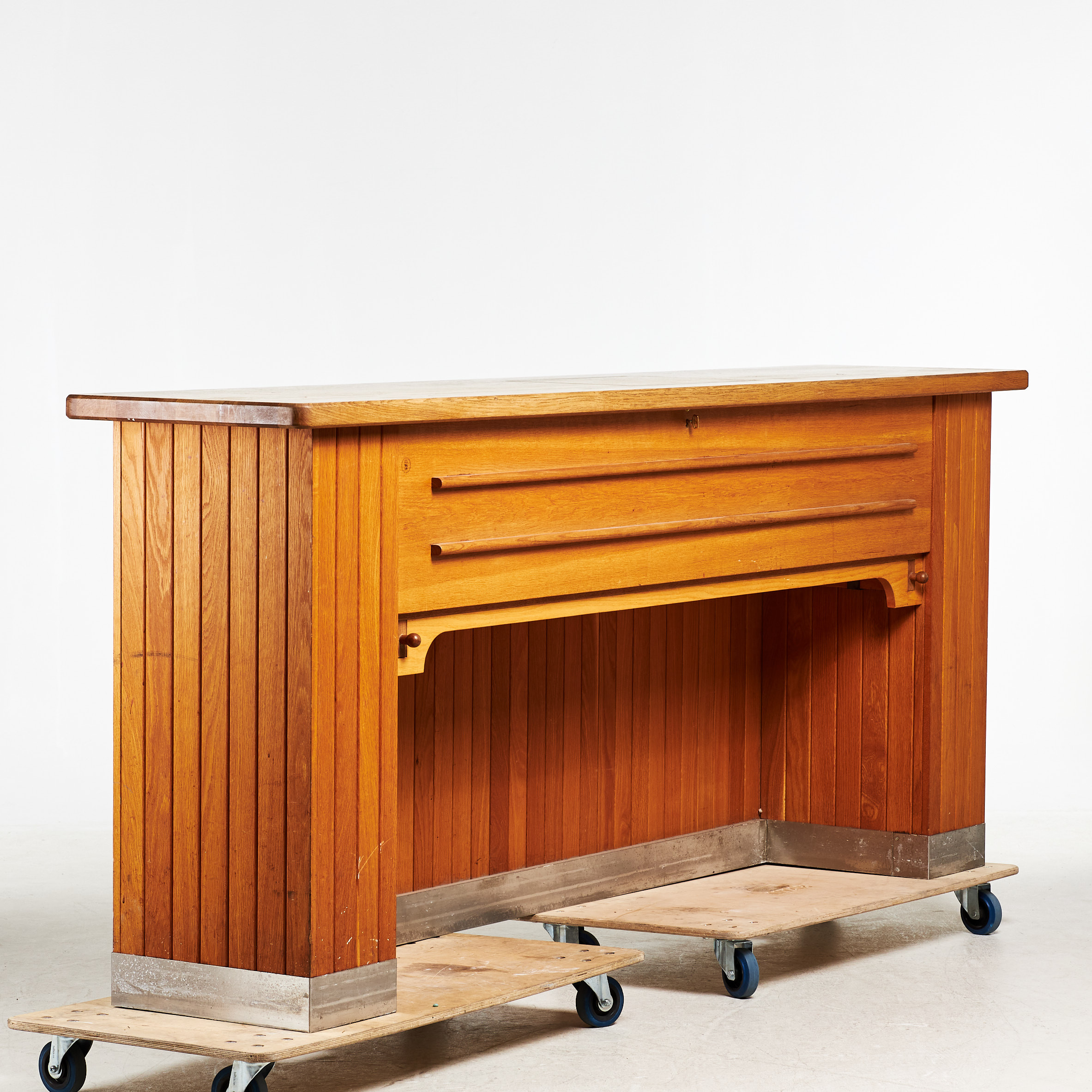 2836302. RECEPTION DESK. Frame in oak, brass lettering, back with writing flap, interior painted, furnished with compartments and shelves, kick strip in metal, second half of the 20th century, marked Kungl. The Academy of Arts.