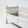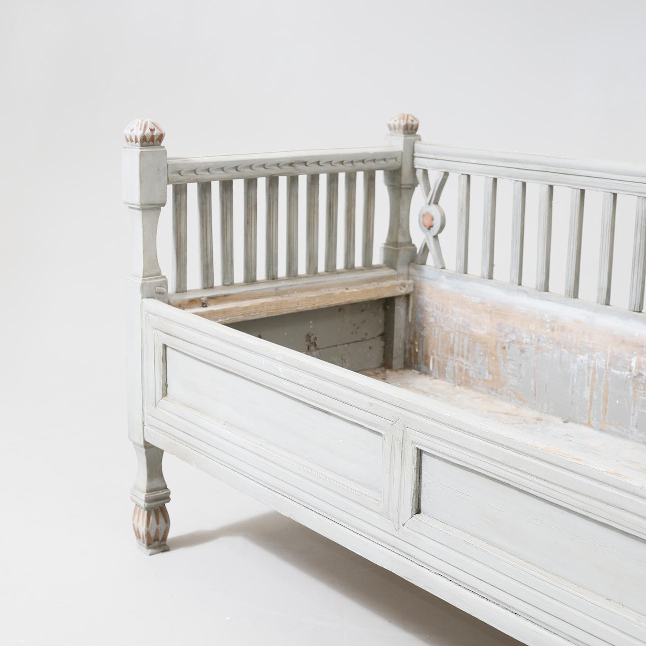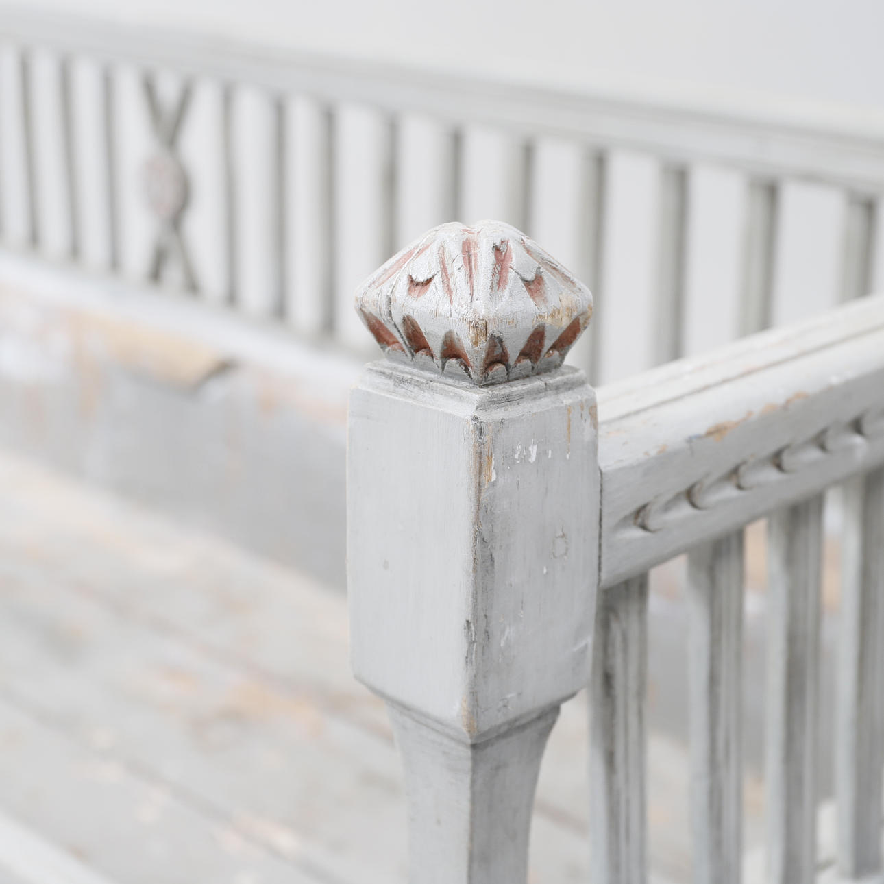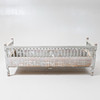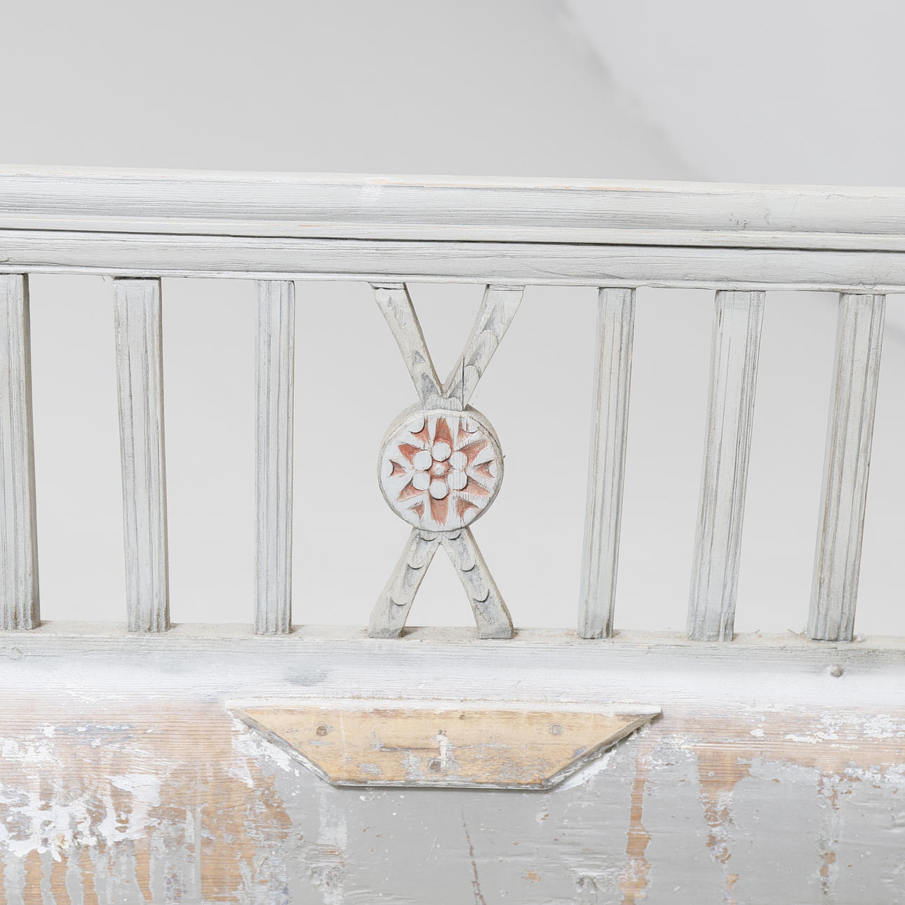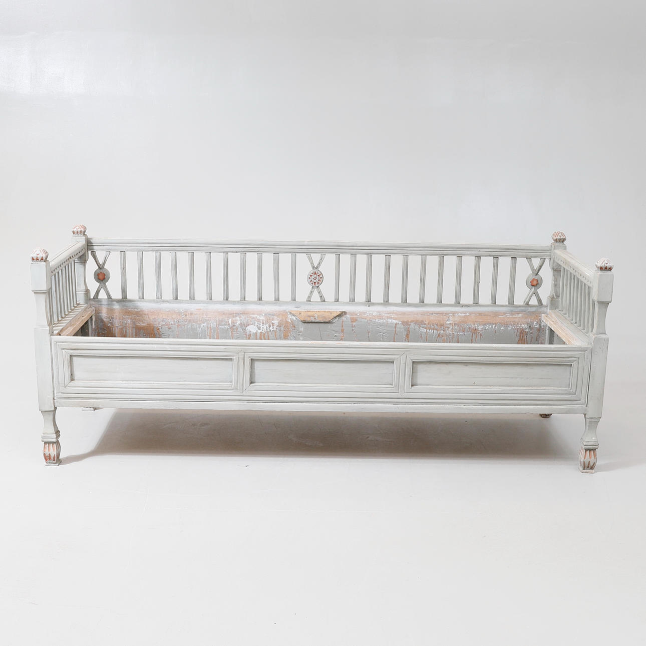 Opened back, cut decoration, mirrors in rim, decorated feet. Length approx. 191 cm, depth 64, back height 76 cm.