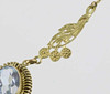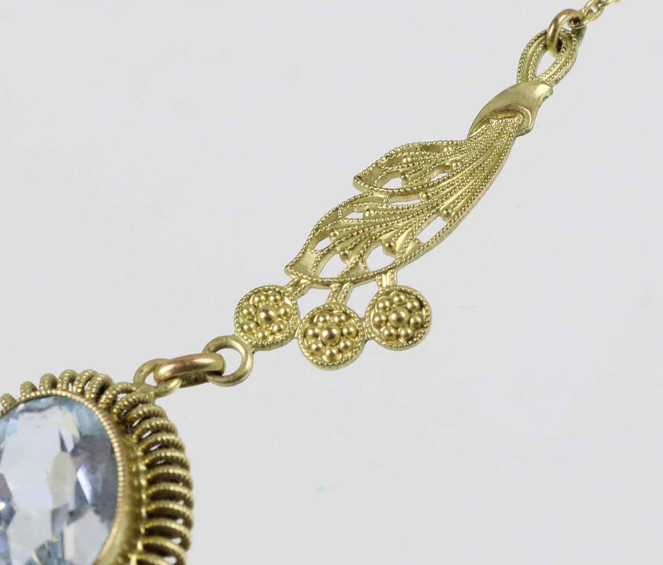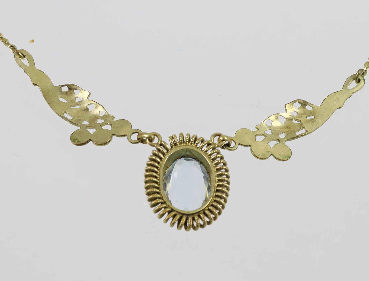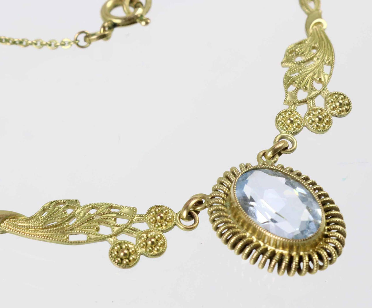 Art Deco necklace with aquamarine spinel, doublé, 1930s. The necklace is hallmarked Andreas Daub Pforzheim and gold double. The three-part central part is held with an aquamarine blue spinel measuring 11 x 8 mm in oval cut in a spiral frame on both sides of 2 florally worked Millegriffes links. Length with fine anchor chain and spring ring clasp 45 cm. Weight 4.7 grams.