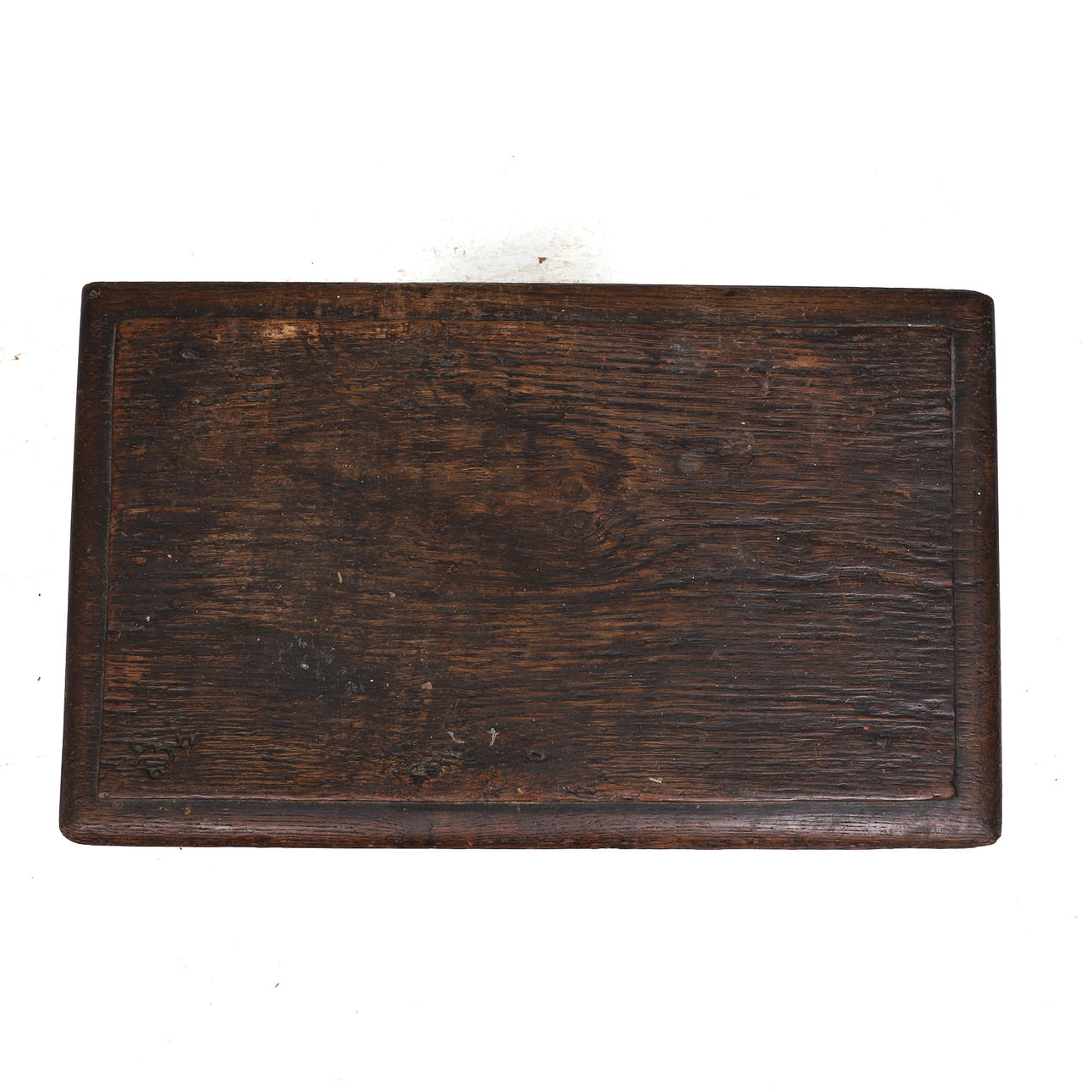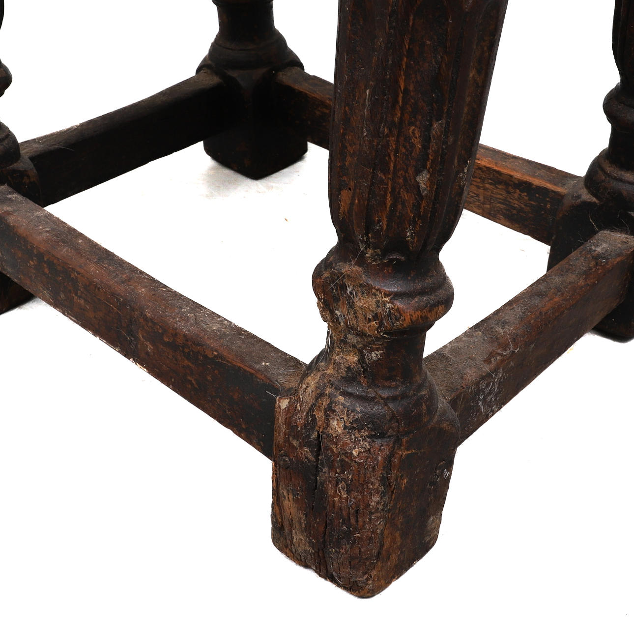 Knocked, marked, scratched and stained, the legs with splits in several places, one leg with severe damage and wear.