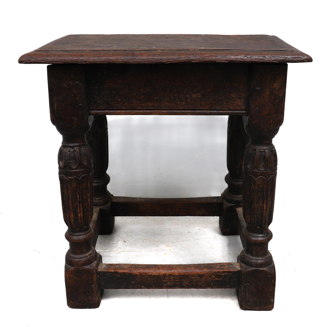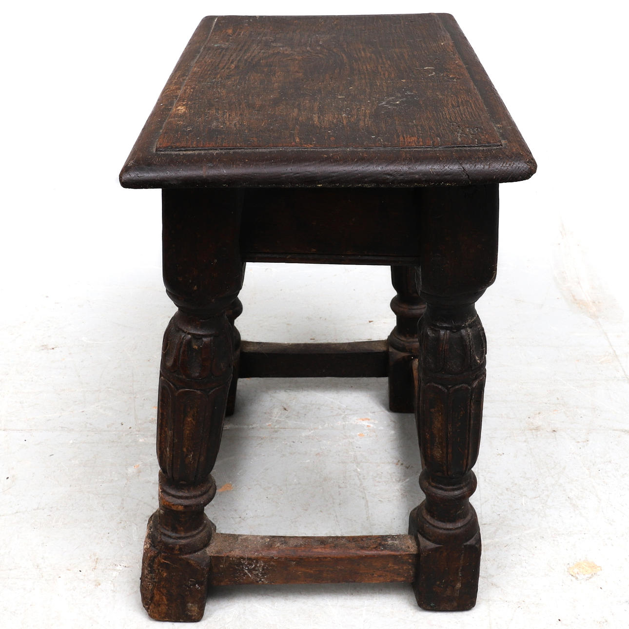 The moulded rectangular top on gouged and ring turned legs united by later stretchers, 45cm wide x 27cm deep x 45cm high