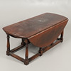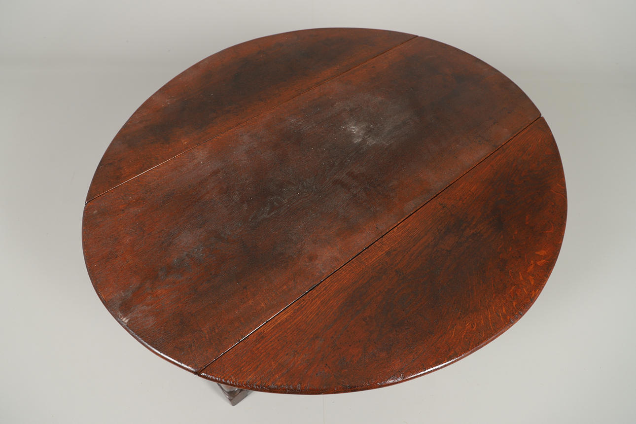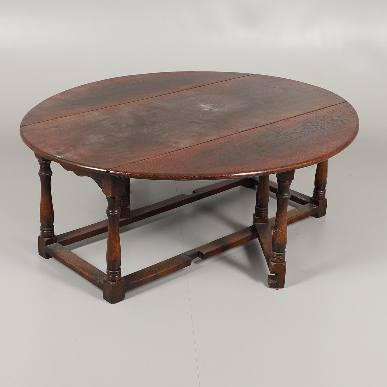 With rounded top surface, on turned legs, block feet and rectangular stretcher. Height 48cm x Length 122cm x Width 50cm. Total extended width 106cm.