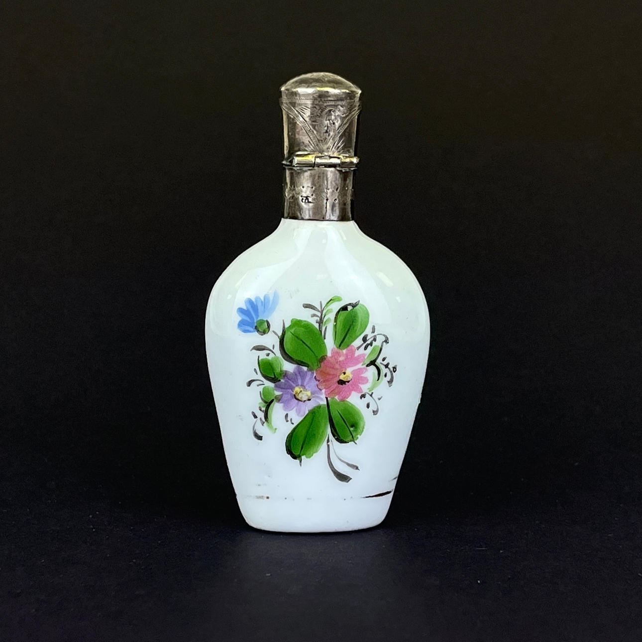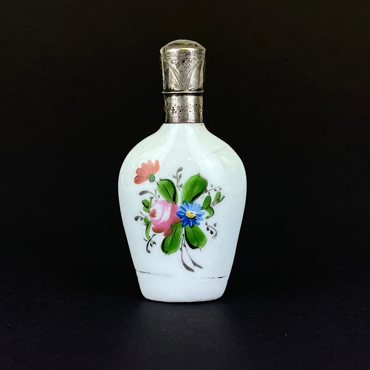 An antique continental silver mounted porcelain perfume bottle, H. 7.5cm.