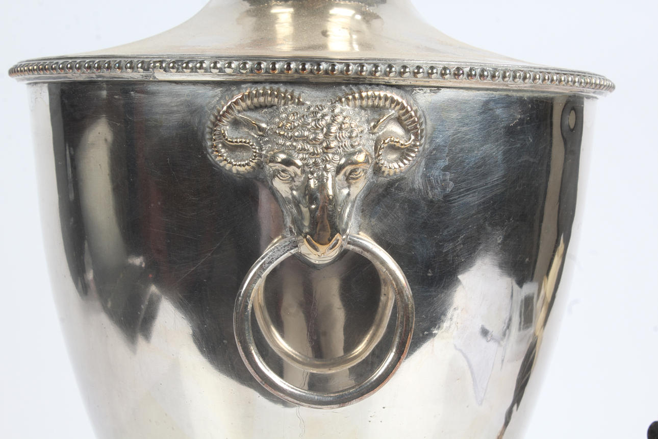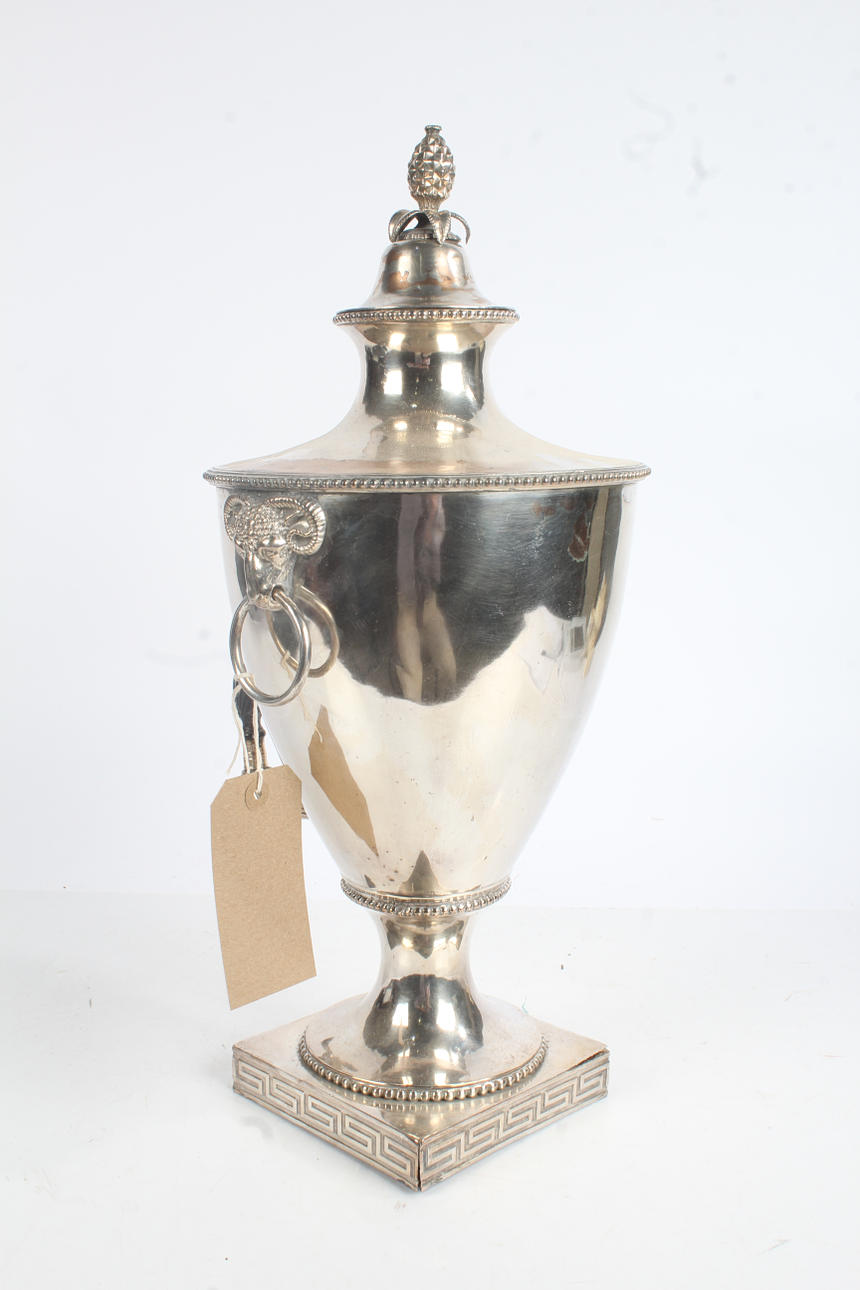 20th century silver plate on copper Samovar with ram mask terminals and greek key decoration 50cm high.