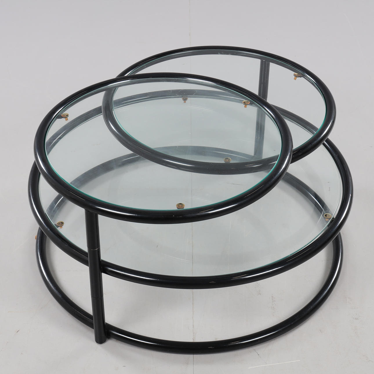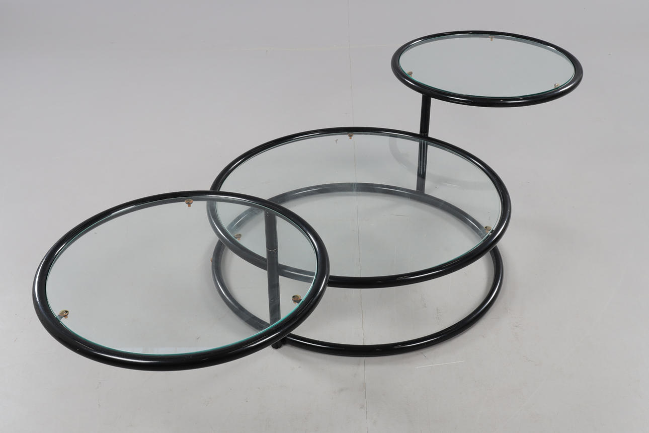 Blackened frame, glass panels, 2 round fold-out glass panels, diameter 54 cm, height approx. 39 cm, diameter 78 cm.