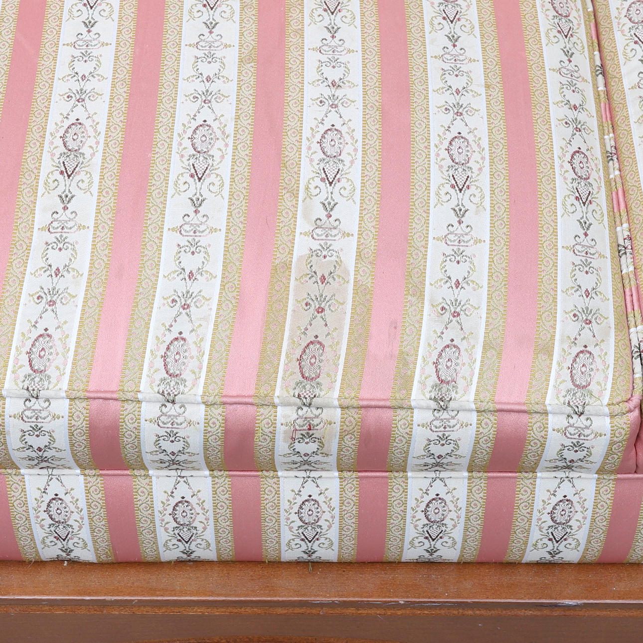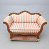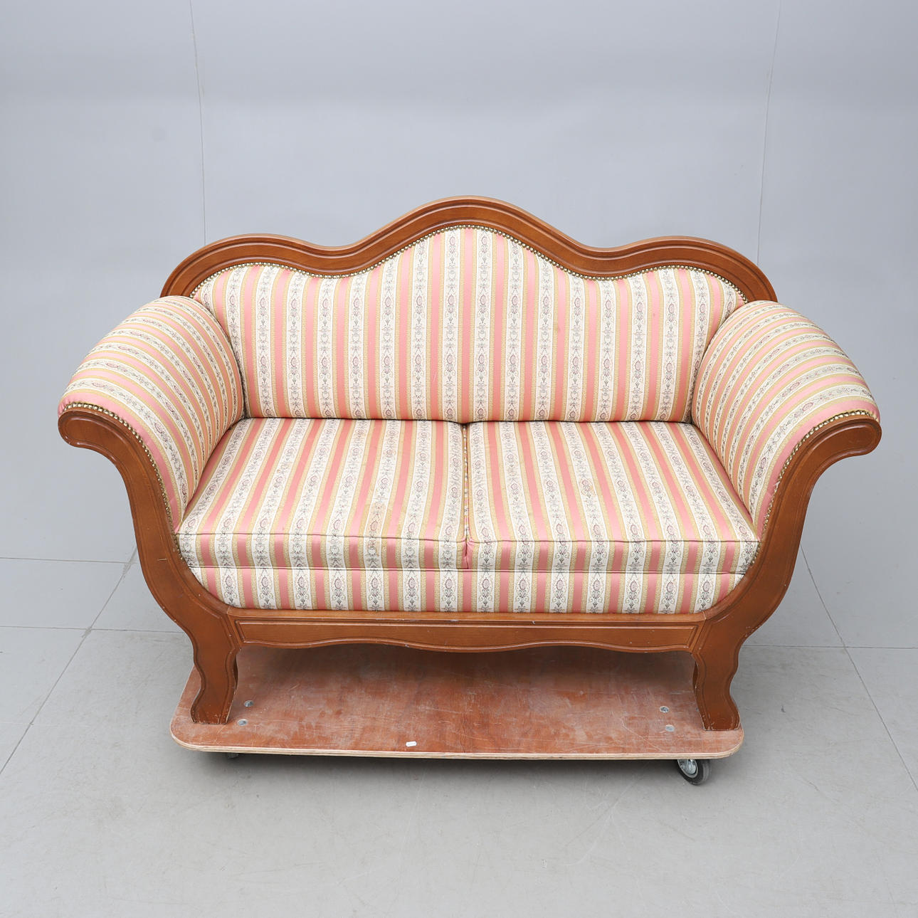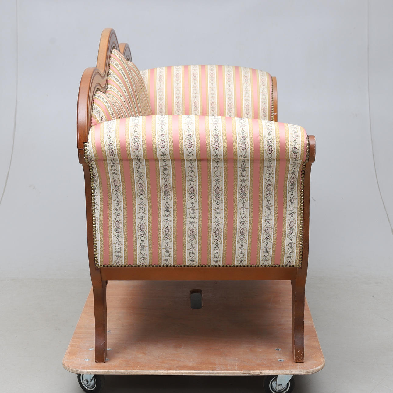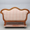 Frame in hardwood, firmly upholstered seat and back. Decoration of pearl nails. Length approx. 145cm, seat height approx. 46cm.