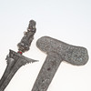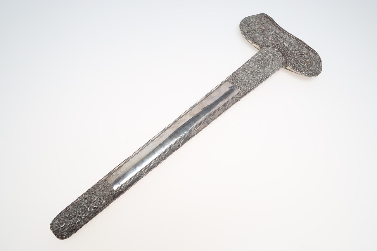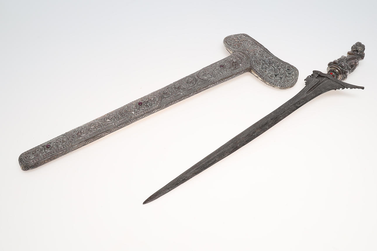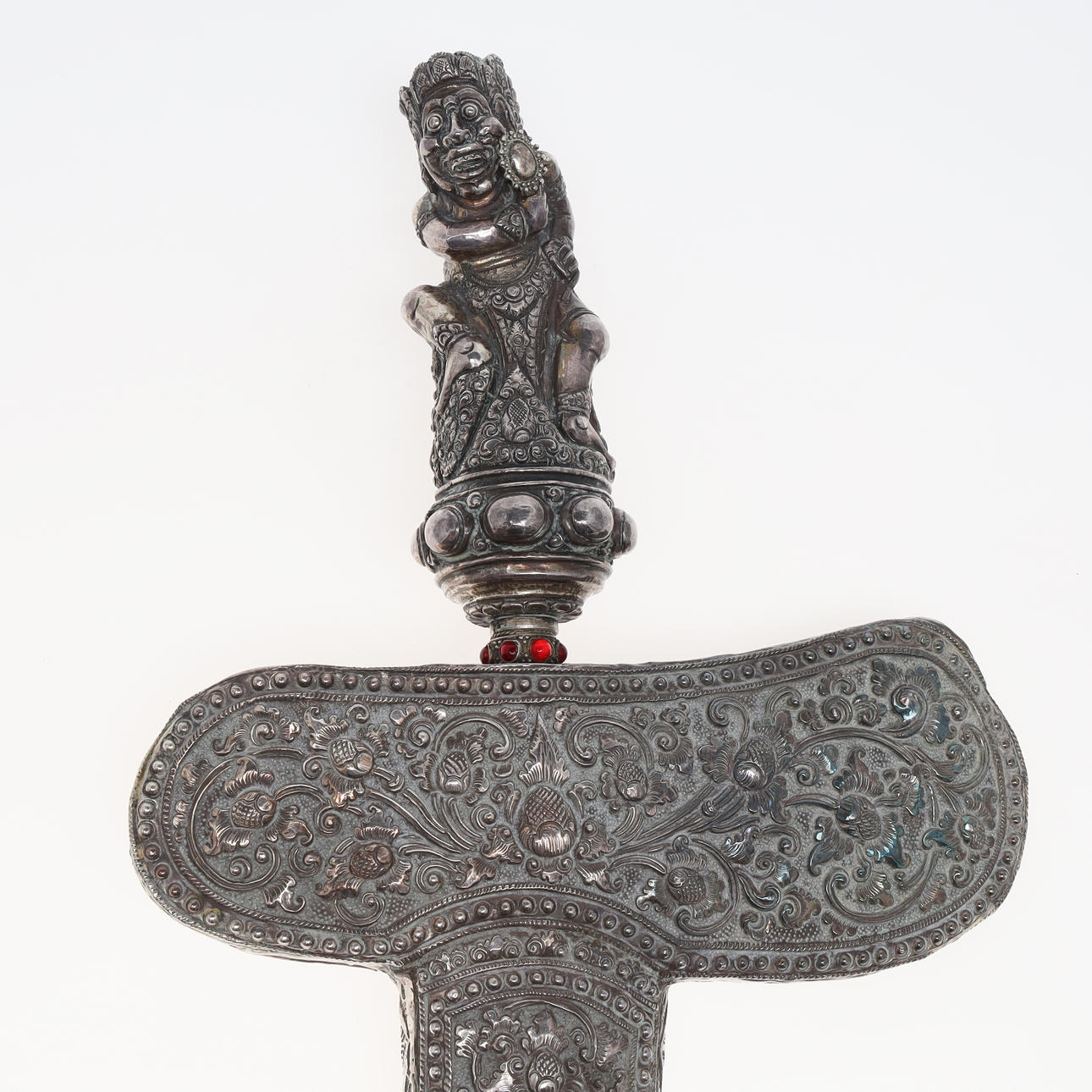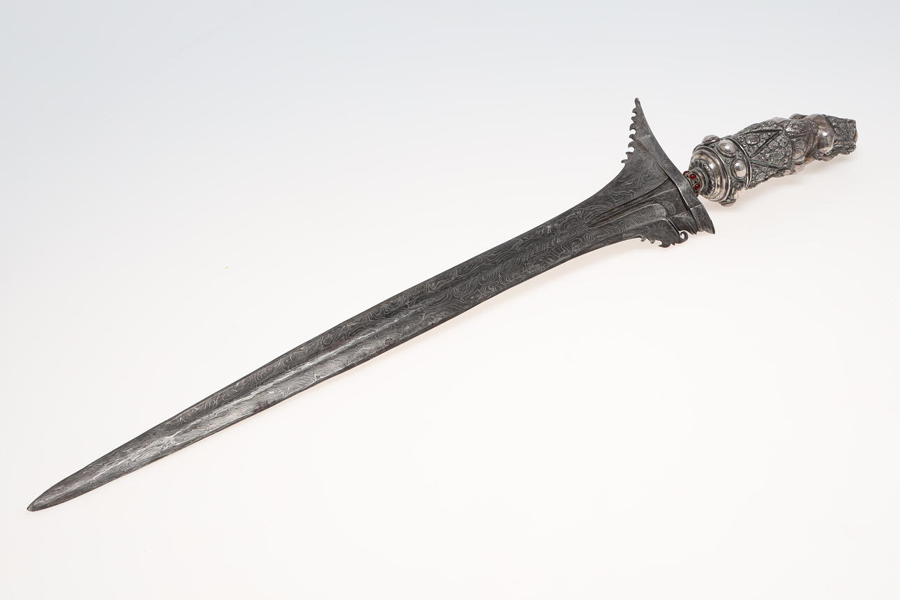Handle in silver in Prabustil, red glass. Richly decorated silver-clad tub of glass beads. Straight damask blade (Pamor). The middle of the 20th century. L total approx. 65 cm. L of the blade approx. 43 cm.