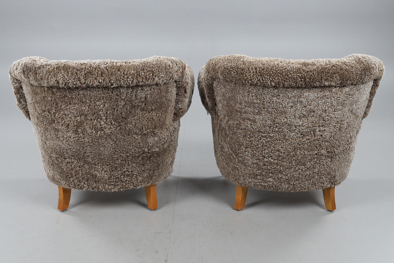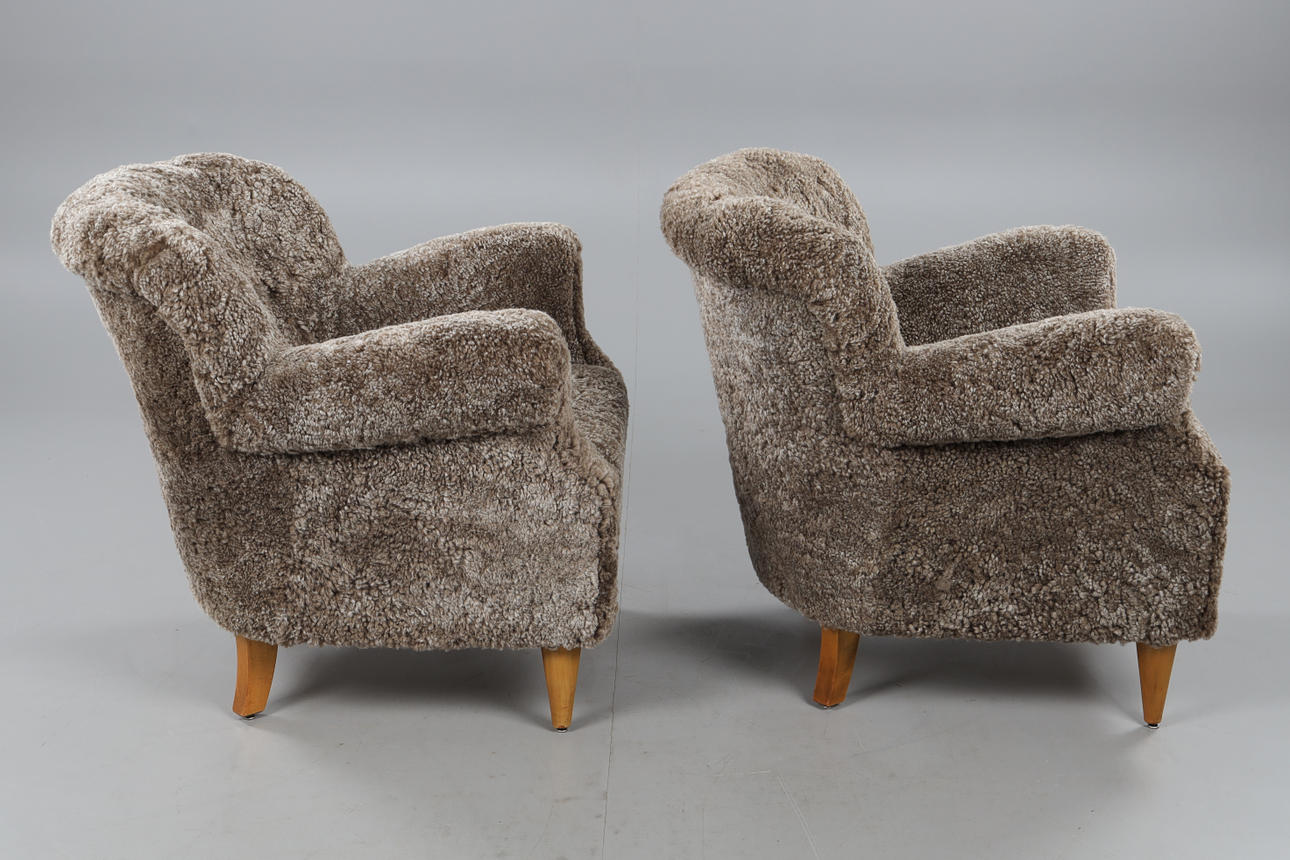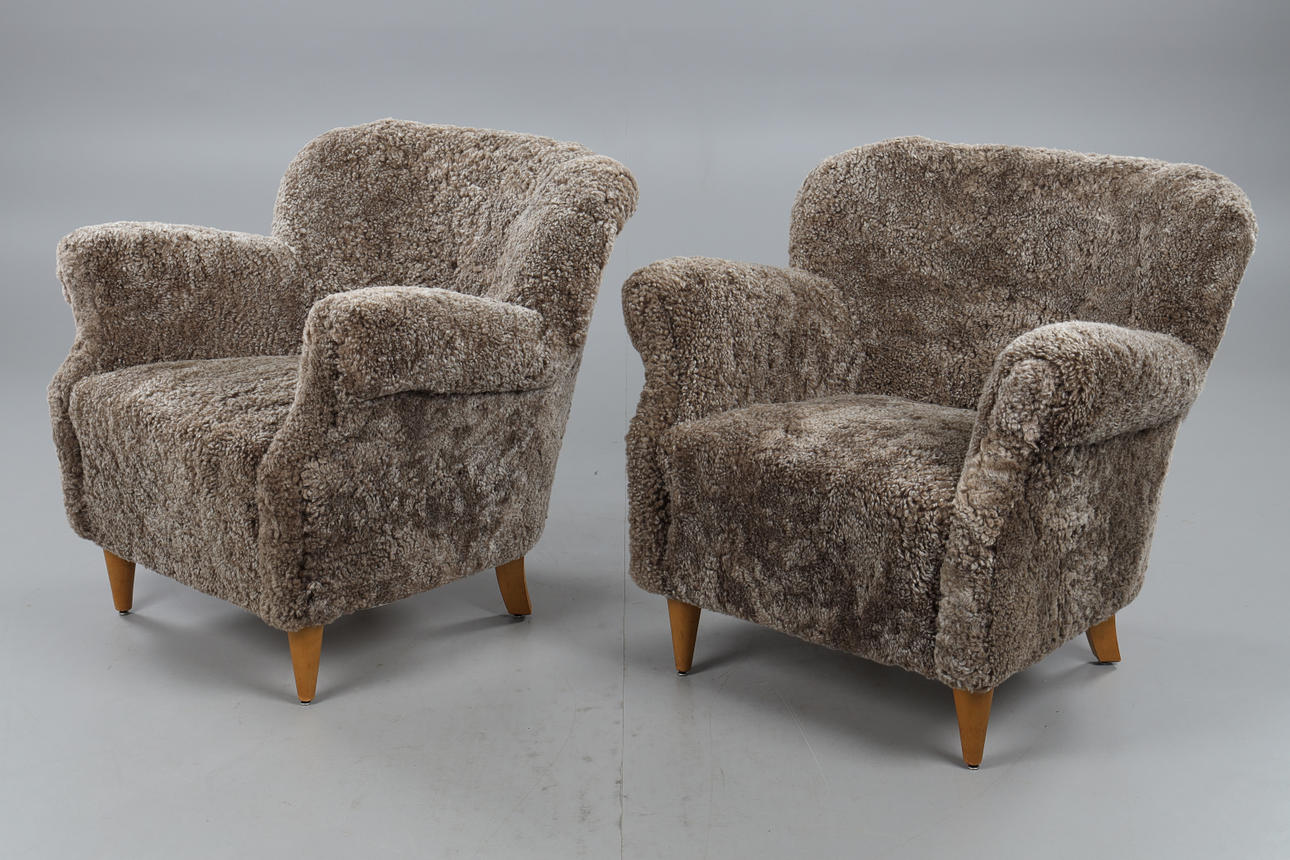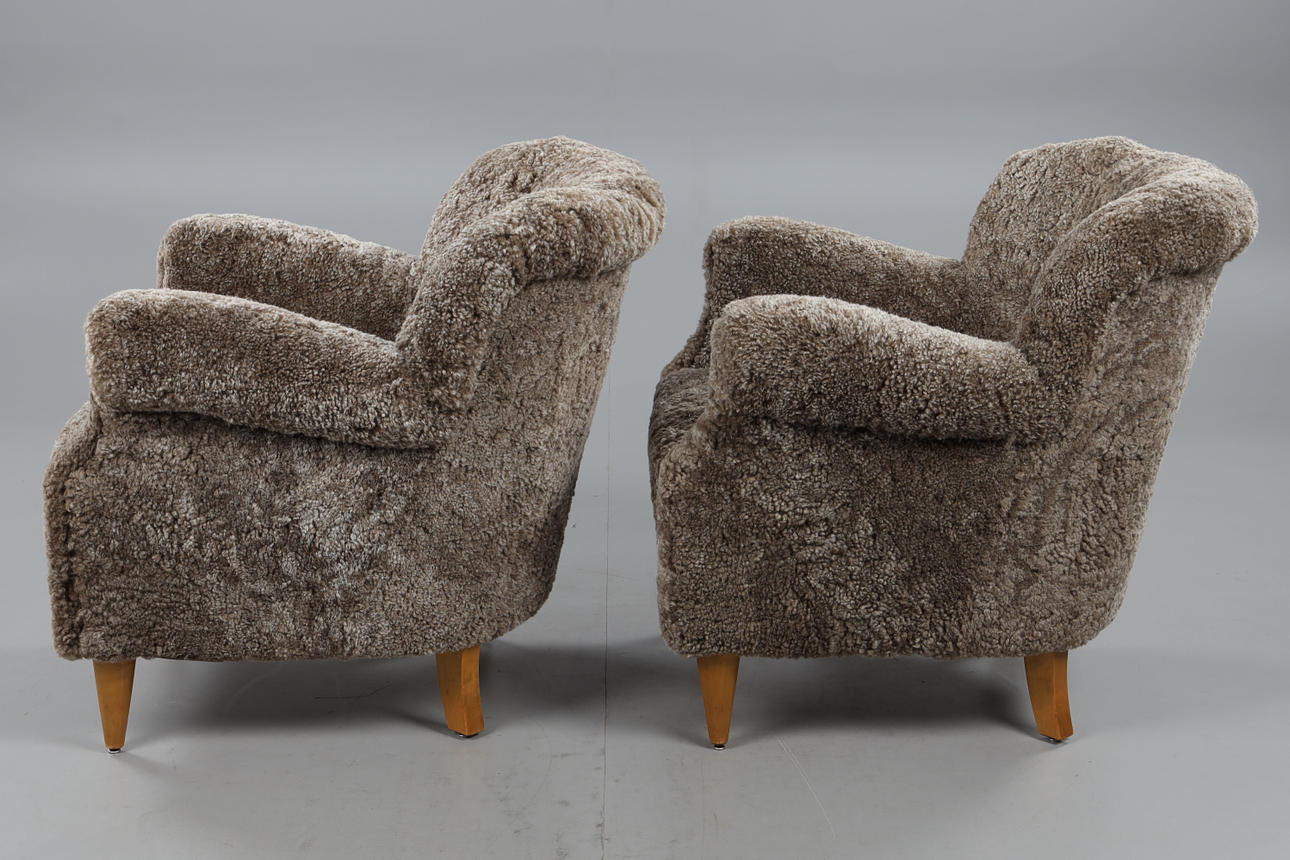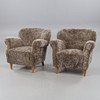 2865654. ARMCHAIRS, a pair covered in sheepskin, 1940s.