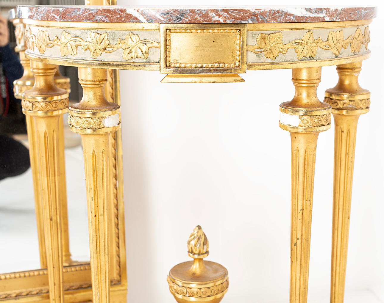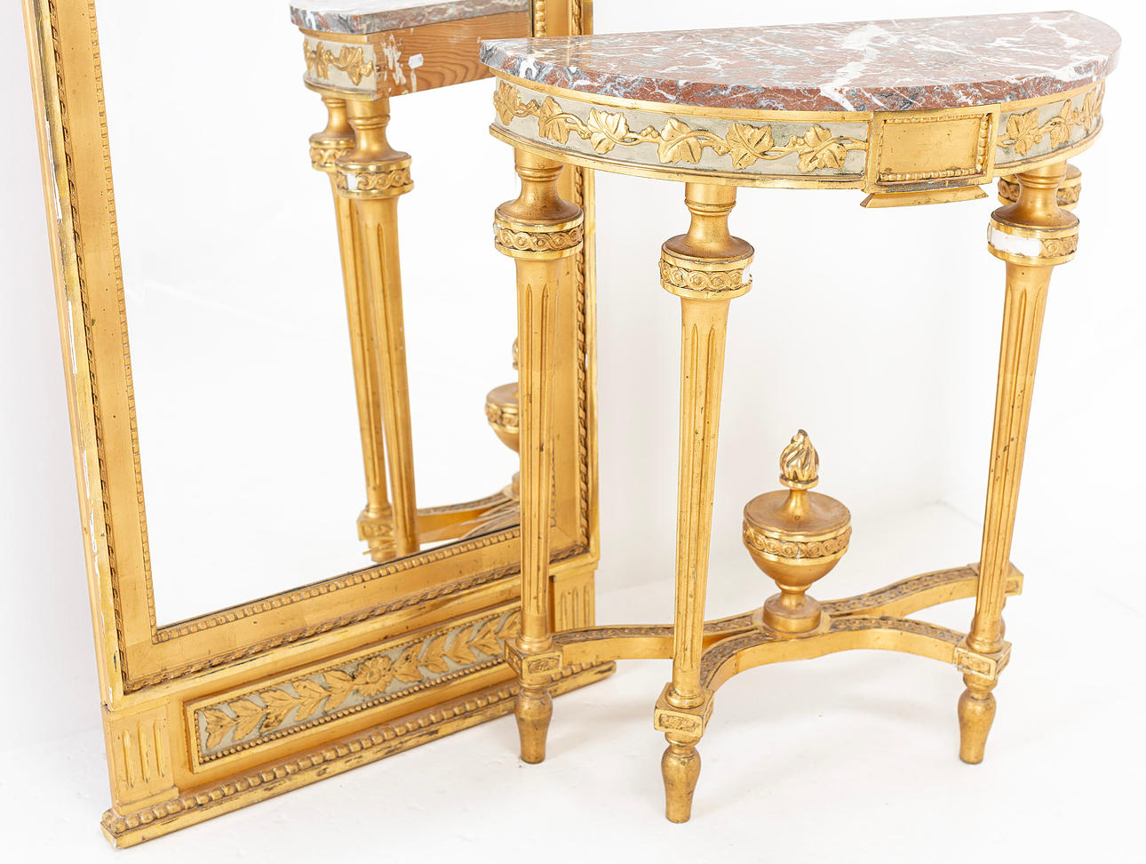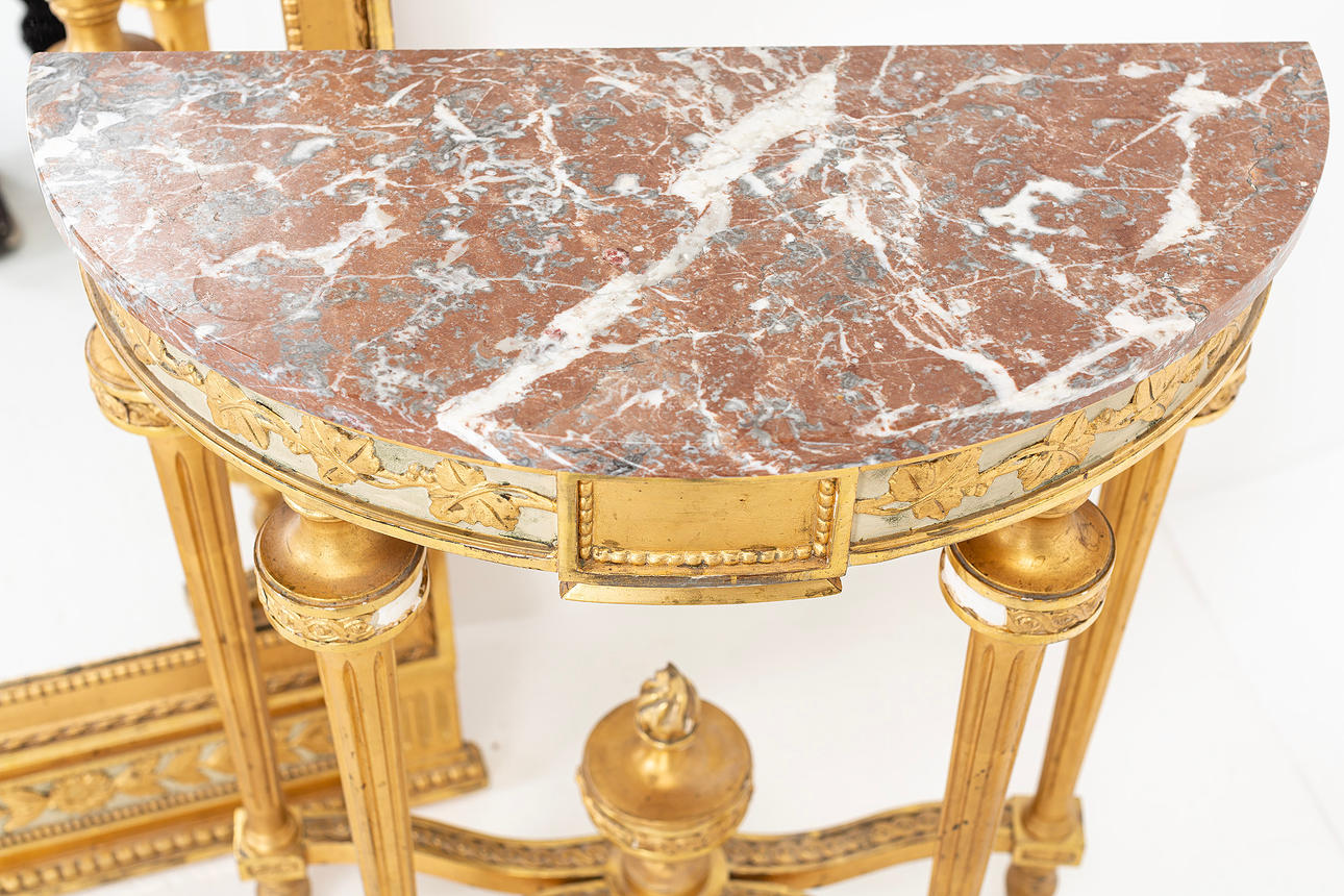 Mirror with minor scratches on the gilding at the edges, console table with chipped wood and Normal wear and tear.