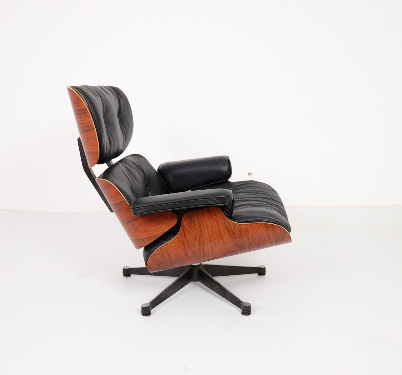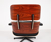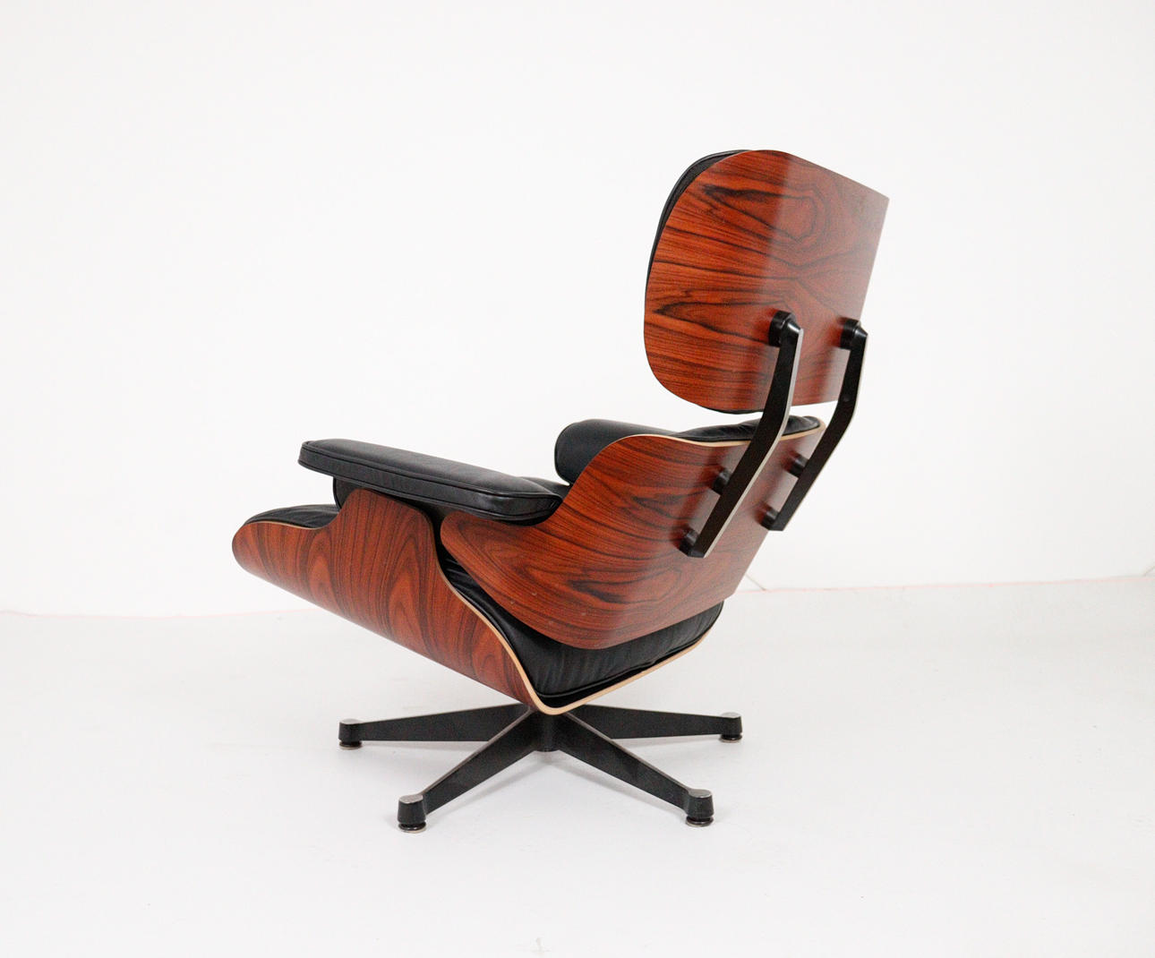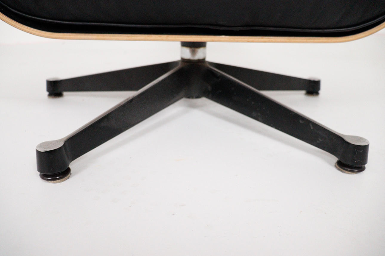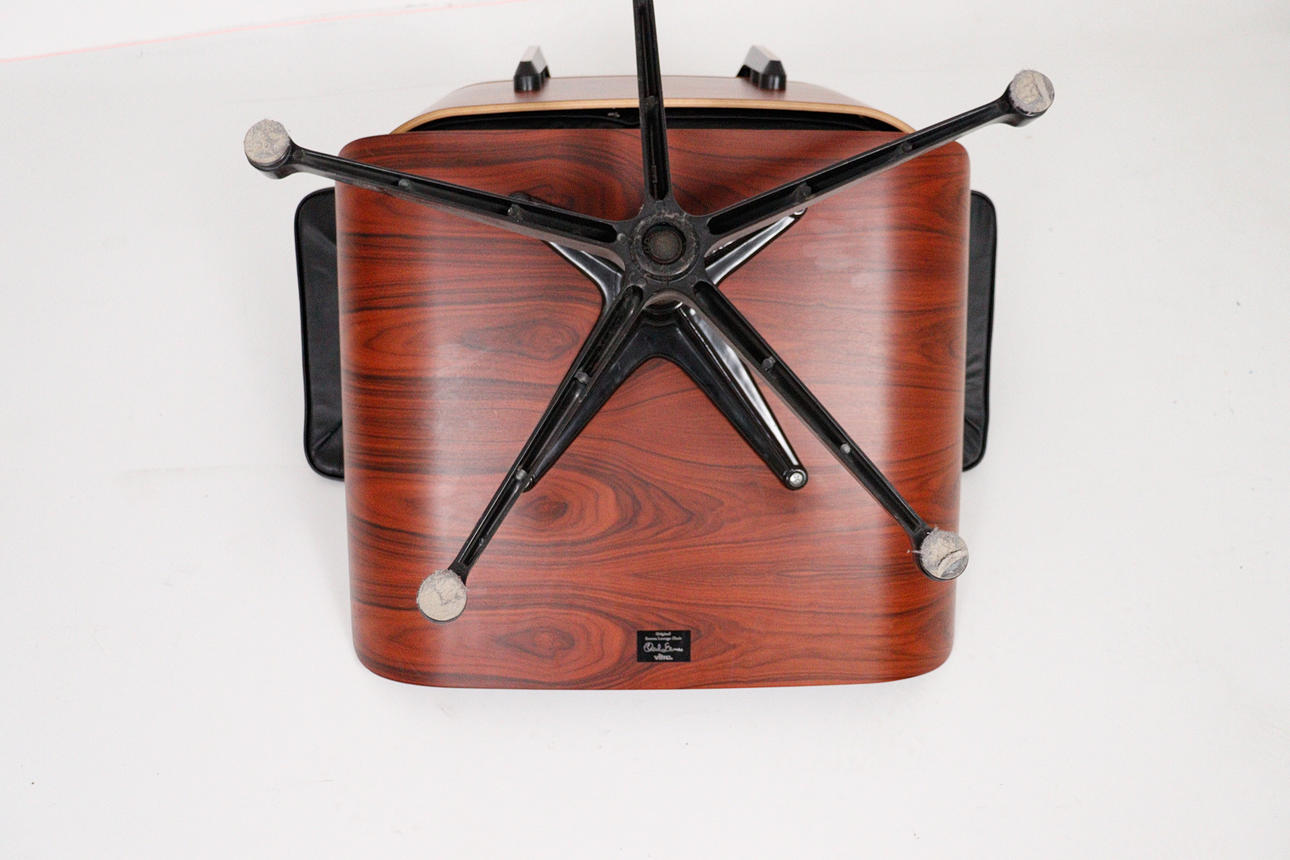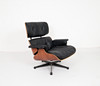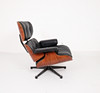 CHARLES & RAY EAMES. Vitra. Eames lounge chair, black. 2010.Wood, aluminum and leather. Draft: 1956. Rosewood version 2010 (no Cites certificate required). Seat and back shells as well as armrests made of veneered molded plywood. Removable cover and upholstery units, covers in black leather. Swivel 5-star base and backrest bar made of black lacquered, polished die-cast aluminium. H 84cm x W 82cm x D 88cm. Inscribed several times on the underside / on the back.