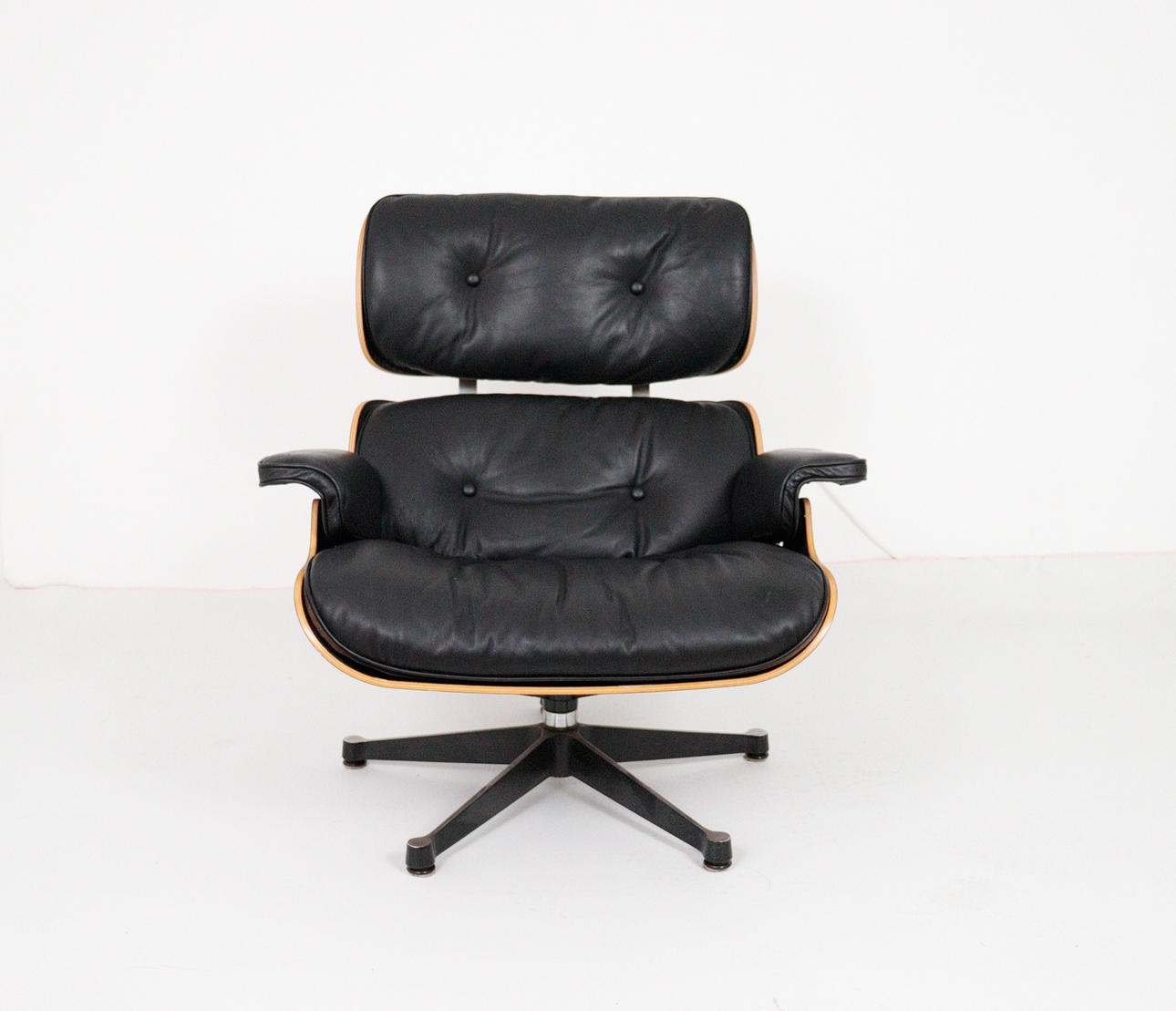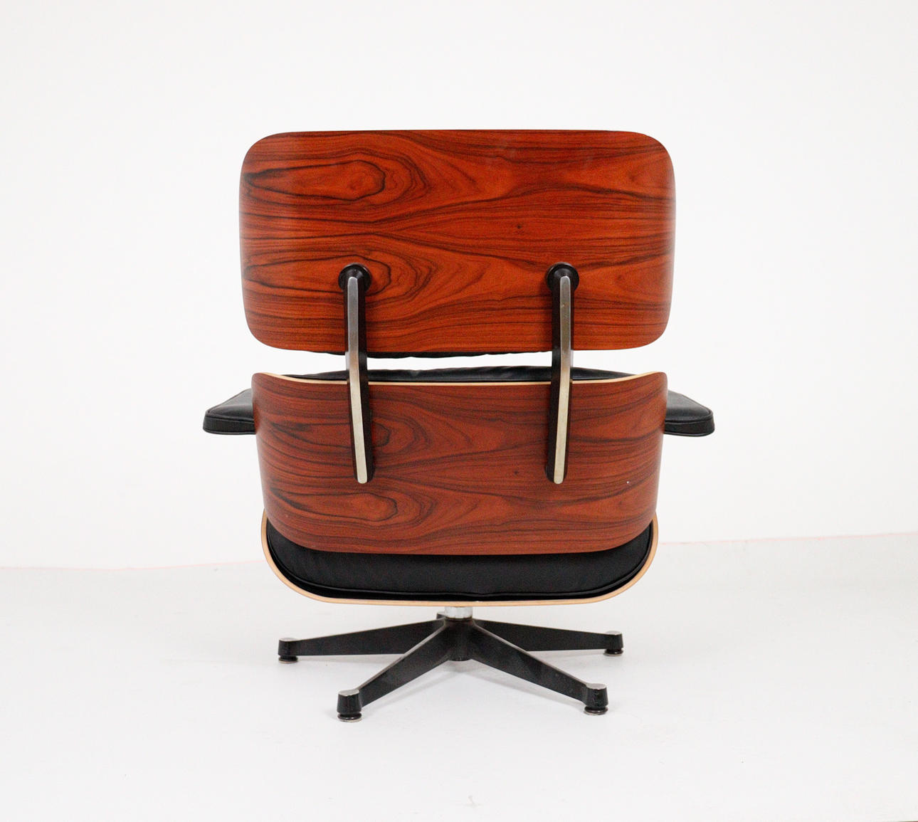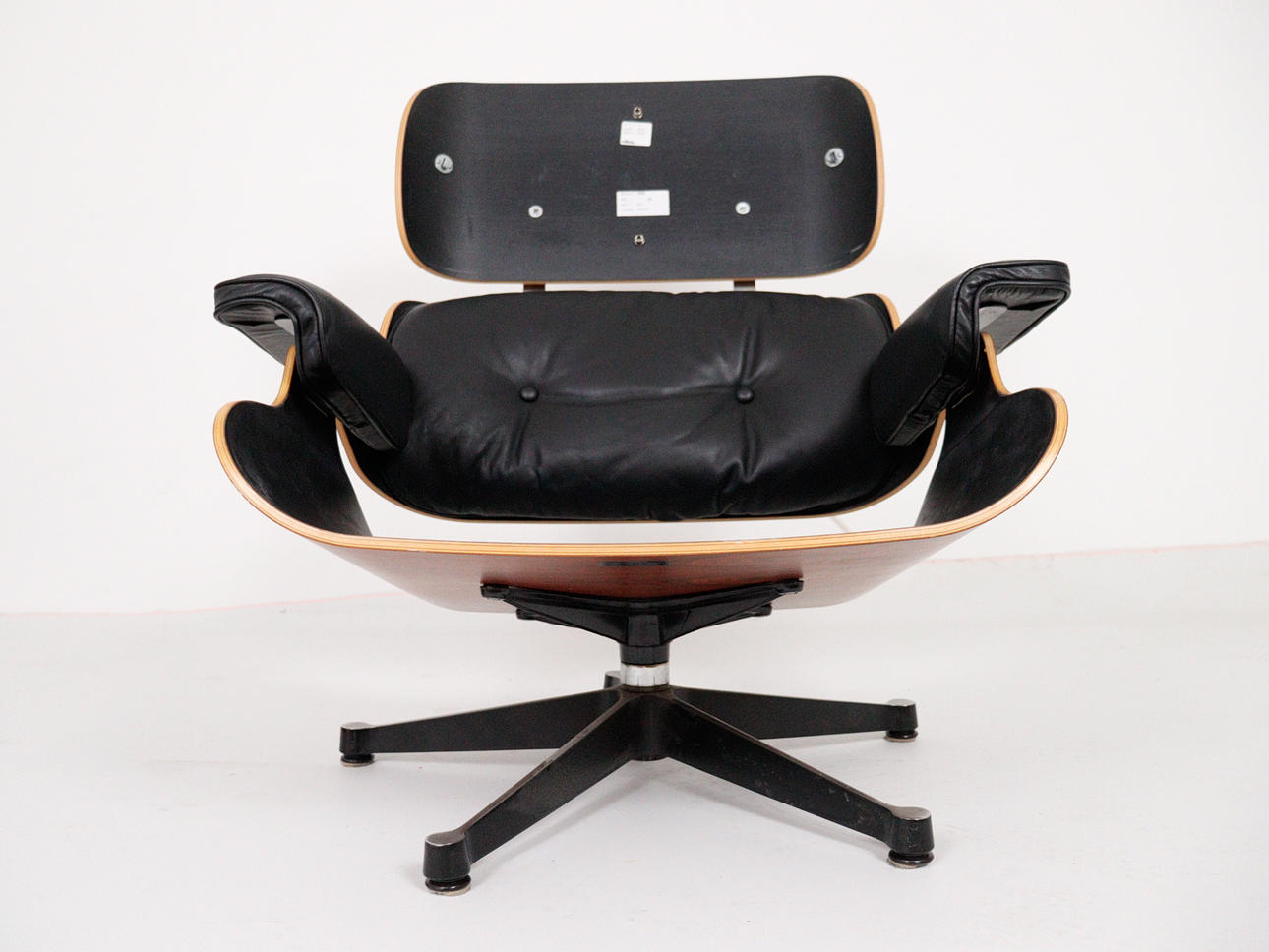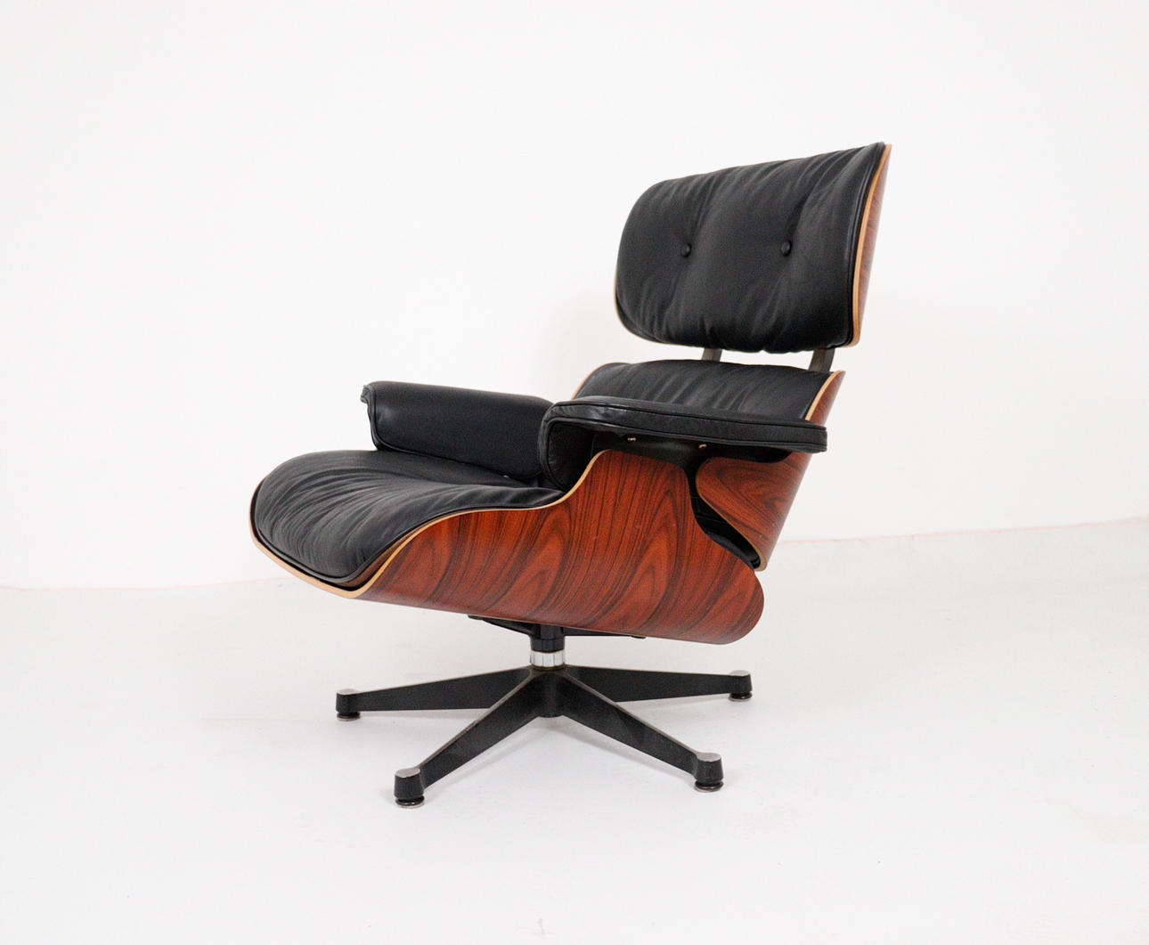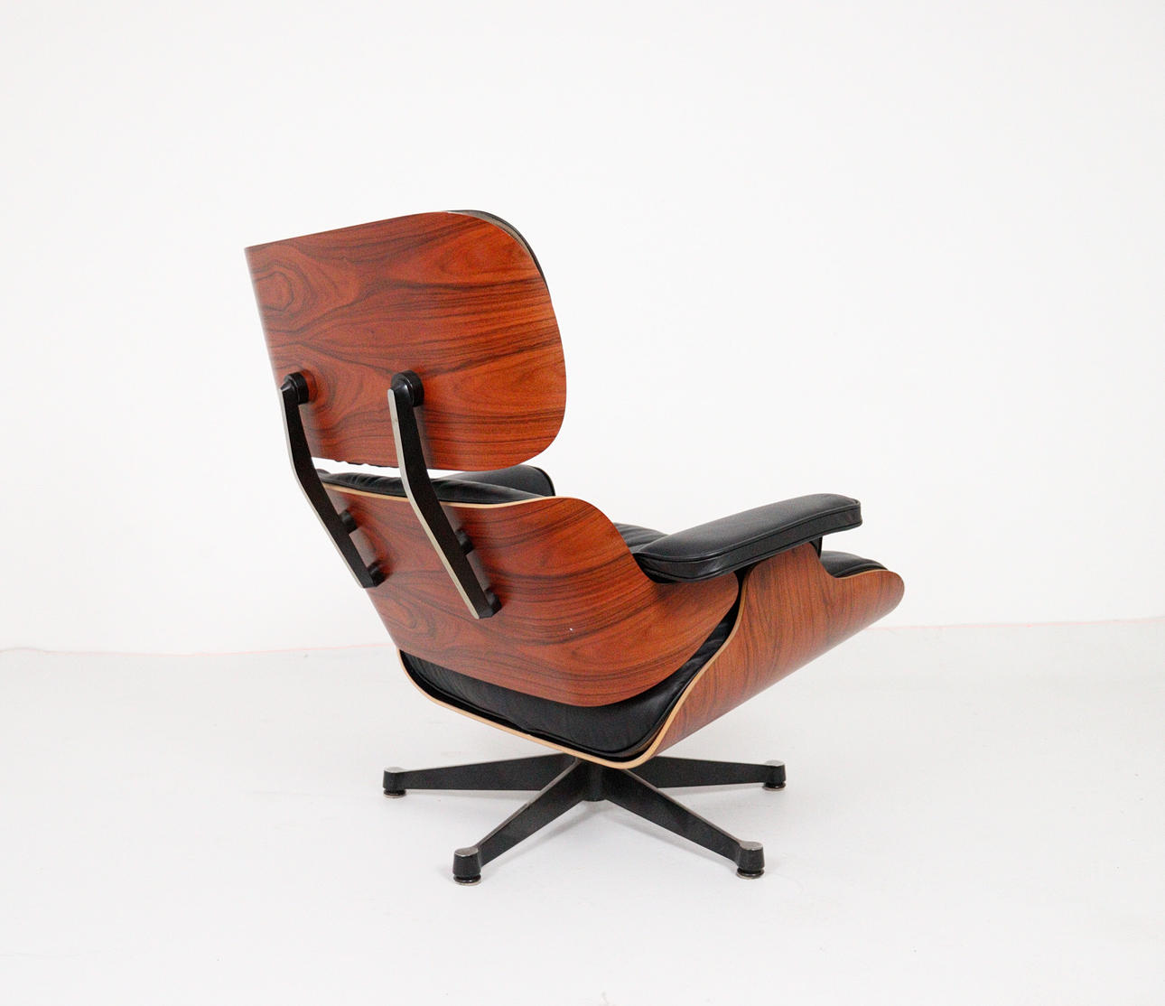 CHARLES & RAY EAMES. Vitra. Eames lounge chair, black. 2010.Wood, aluminum and leather. Draft: 1956. Rosewood version 2010 (no Cites certificate required). Seat and back shells as well as armrests made of veneered molded plywood. Removable cover and upholstery units, covers in black leather. Swivel 5-star base and backrest bar made of black lacquered, polished die-cast aluminium. H 84cm x W 82cm x D 88cm. Inscribed several times on the underside / on the back.