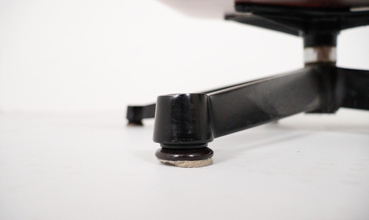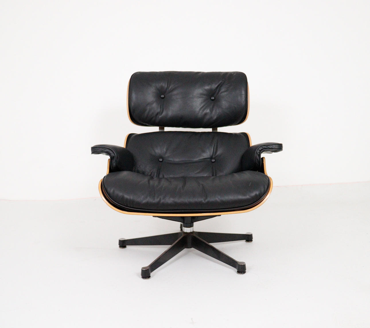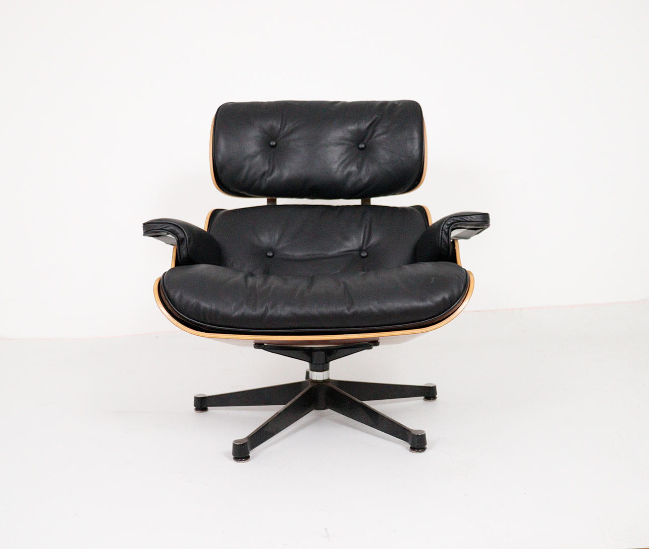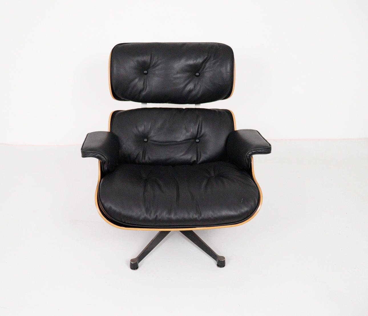 CHARLES & RAY EAMES. Vitra. Eames lounge chair, black. 2010.Wood, aluminum and leather. Draft: 1956. Rosewood version 2010 (no Cites certificate required). Seat and back shells as well as armrests made of veneered molded plywood. Removable cover and upholstery units, covers in black leather. Swivel 5-star base and backrest bar made of black lacquered, polished die-cast aluminium. H 84cm x W 82cm x D 88cm. Inscribed several times on the underside / on the back.