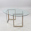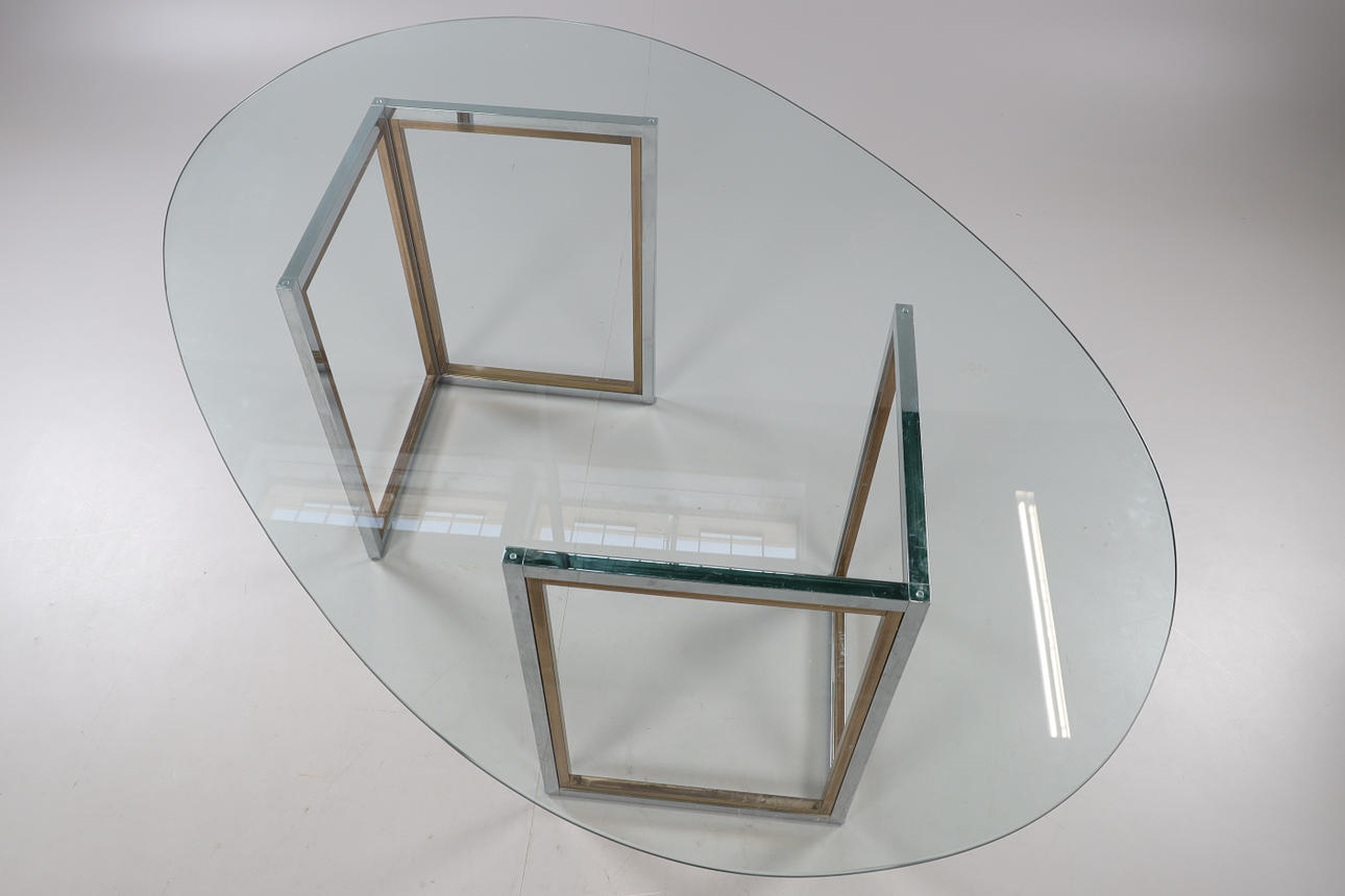 Oval glass top, 2 angle bases in chromed steel and brass. H approx. 71 cm. approx. 175 x 112 cm.