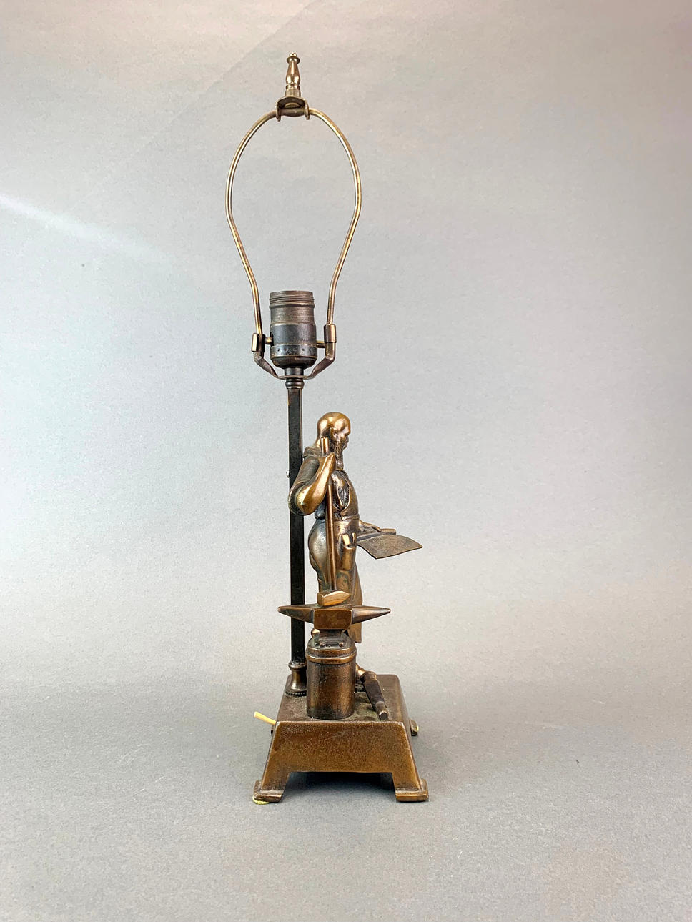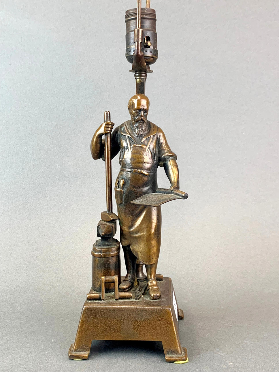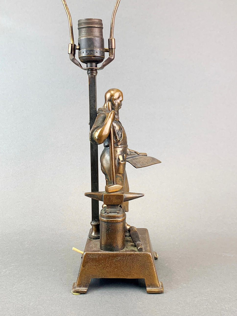 An early 20th Century bronze table lamp base of a blacksmith, figure H. 26cm. Overall H. 53cm.