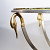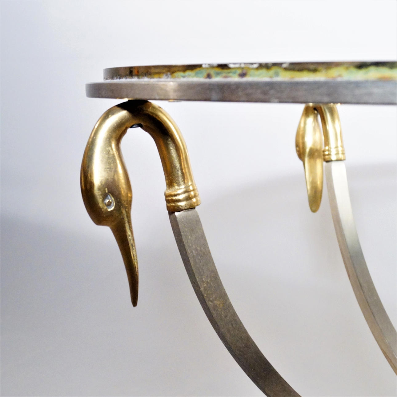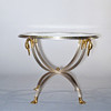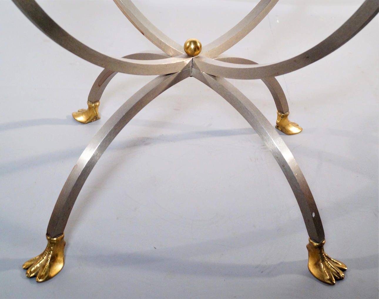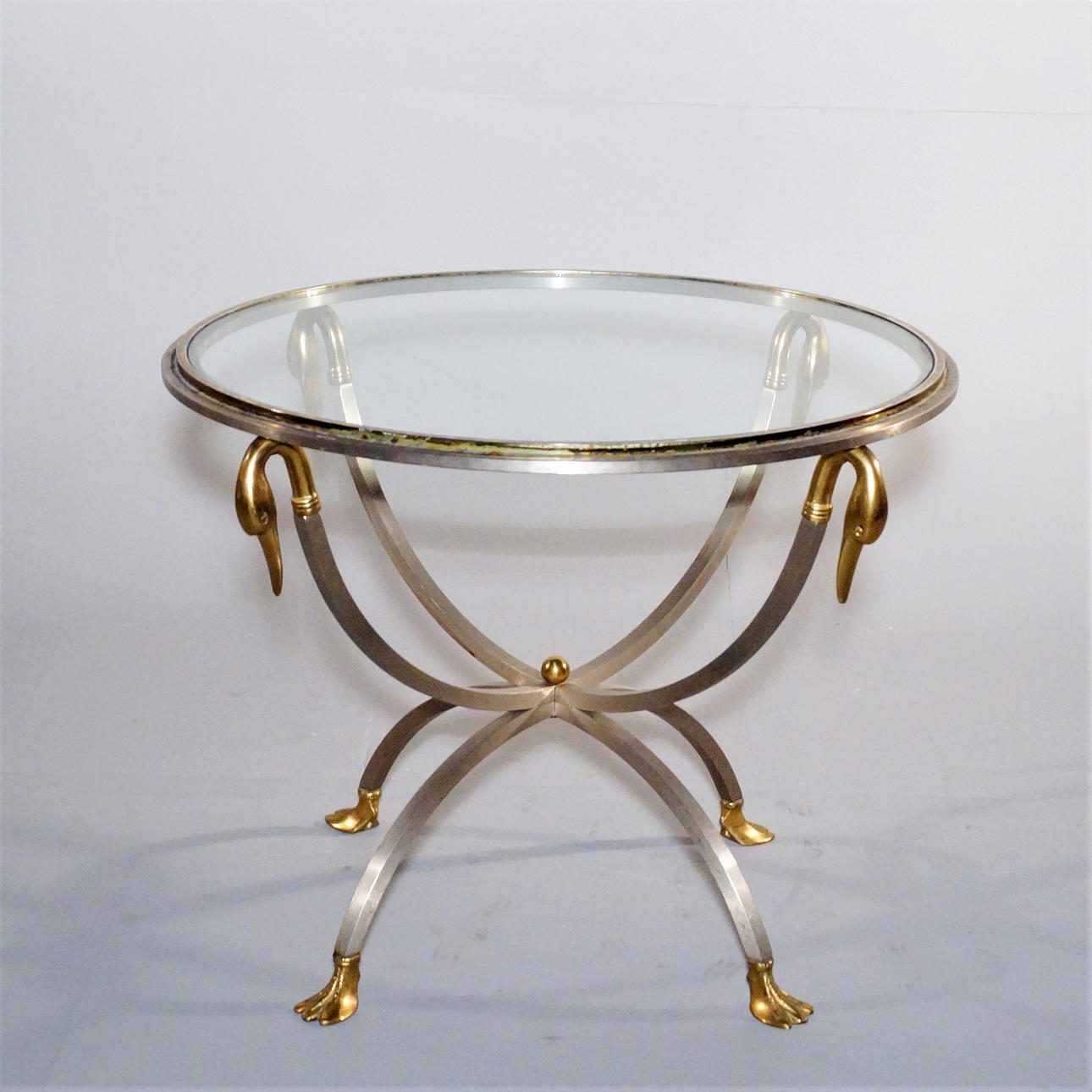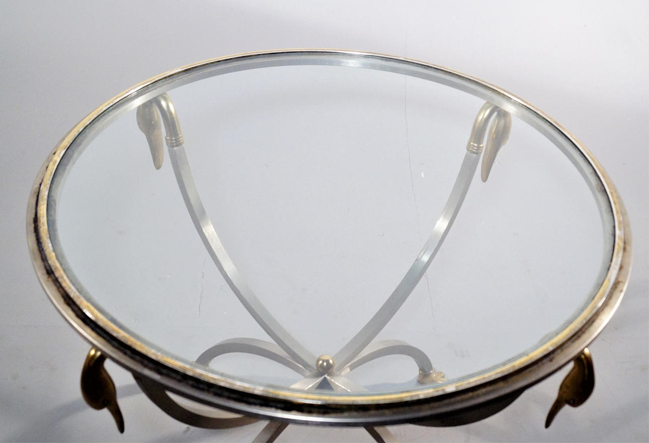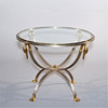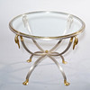 Metal chassis in brushed steel, brass details, clear glass top. Height: 49cm Disc Ø: 61.5 cm.