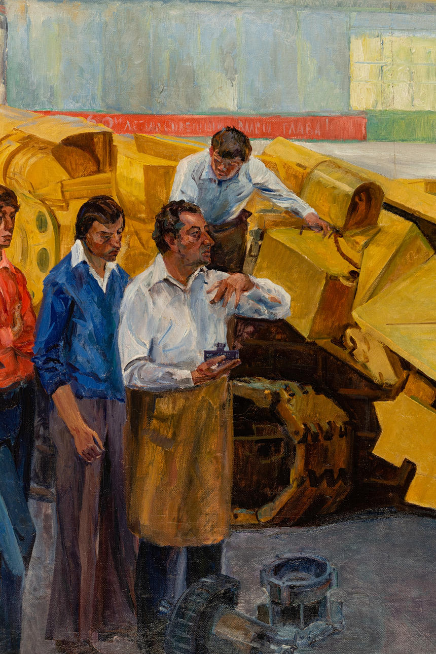 Ivan Ivanovich Bondar (b. 1944), Die Mechaniker, 1979, oil on canvas, signed and dated lower right, numbered on the reverse, with a narrow studio strip approx. 132x192 cm.