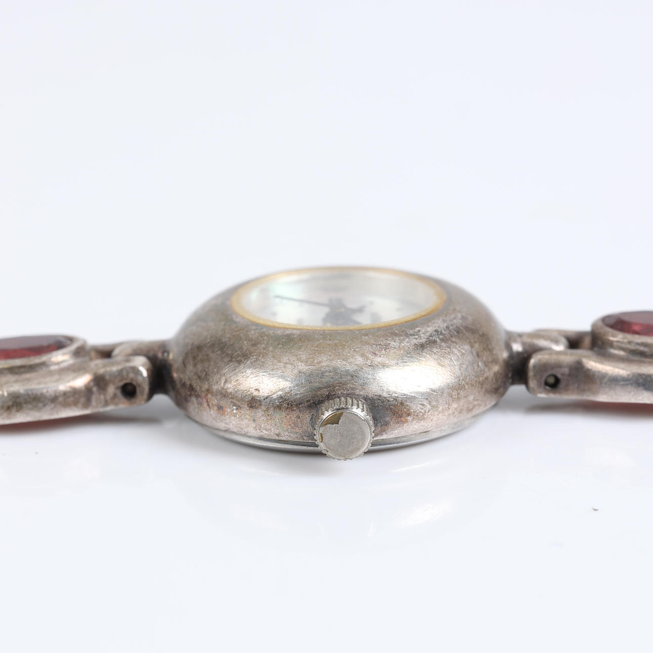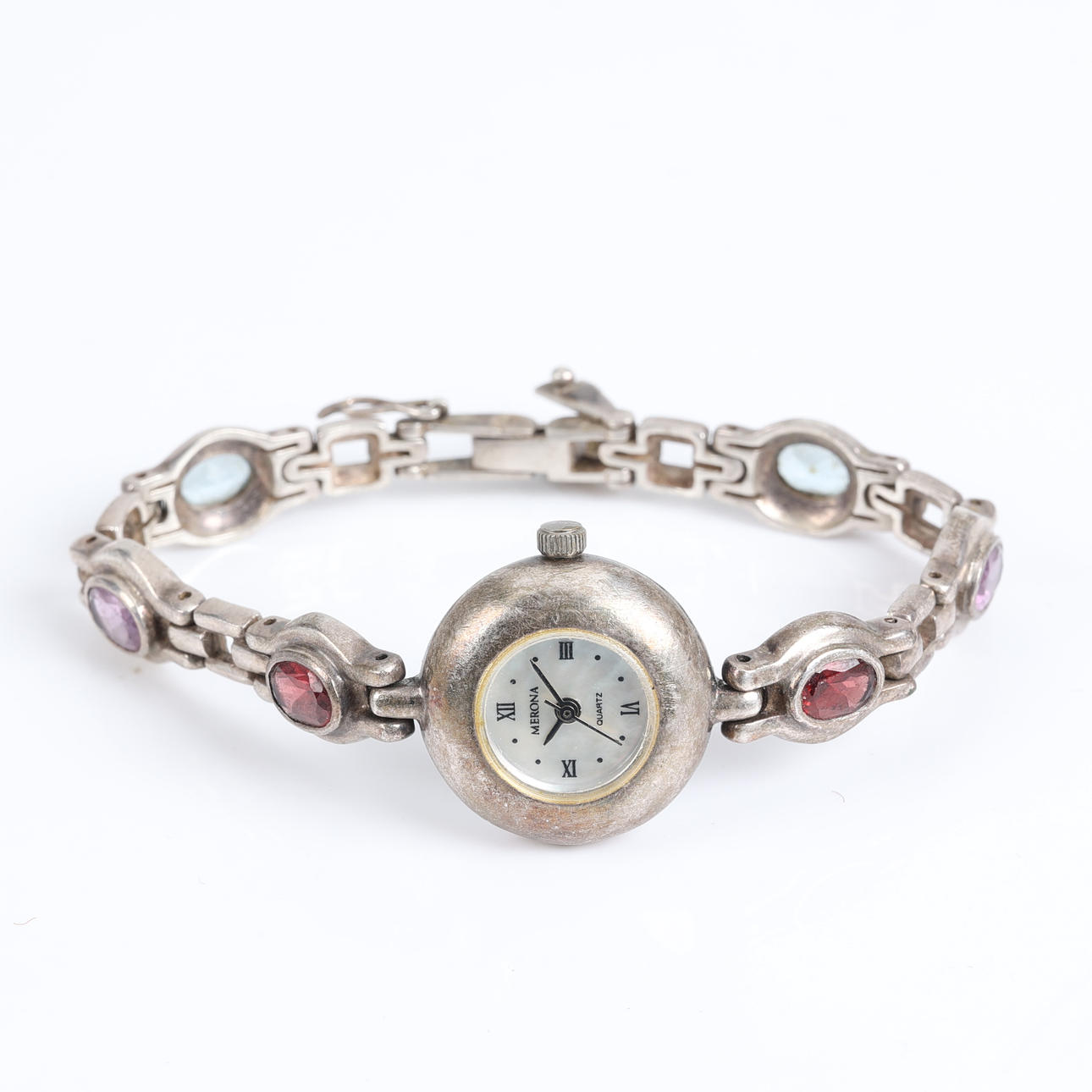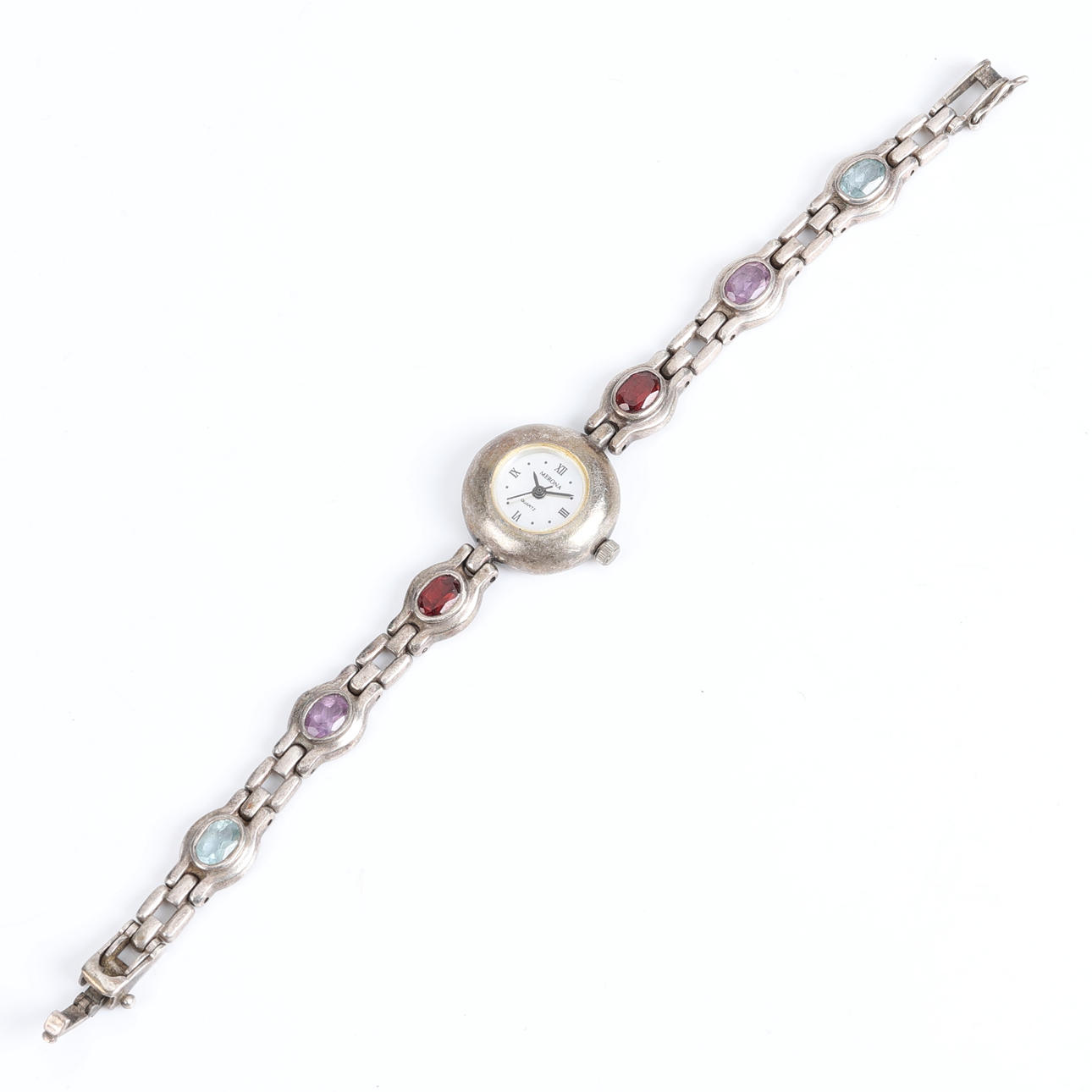 Case and link in silver Link with oval-cut garnets, amethysts and aquamarines Dial in mother-of-pearl Stamped 925, BOMA, C Case diameter 21 mm Quartz movement.