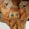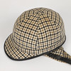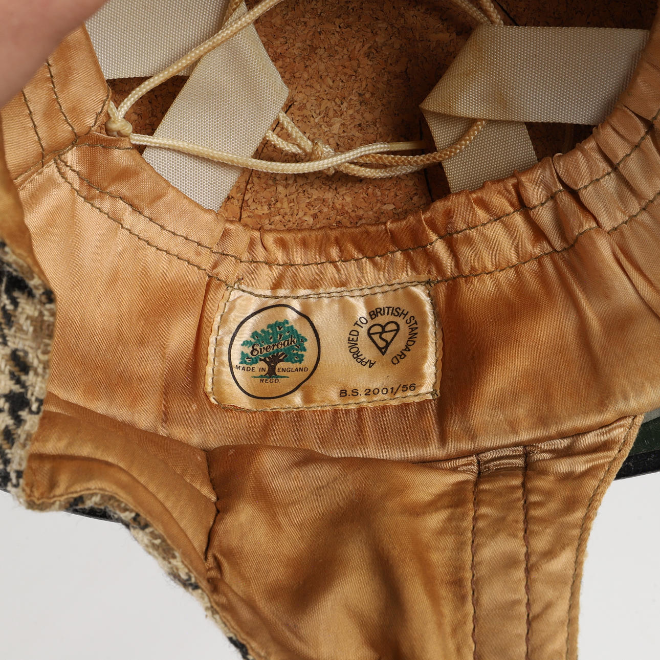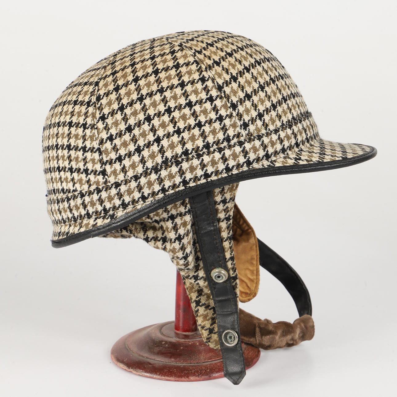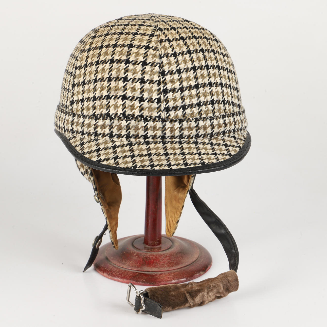 Hound-tooth patterned helmet with imitation leather edging, chin buckle and cork lining Size 7/59.