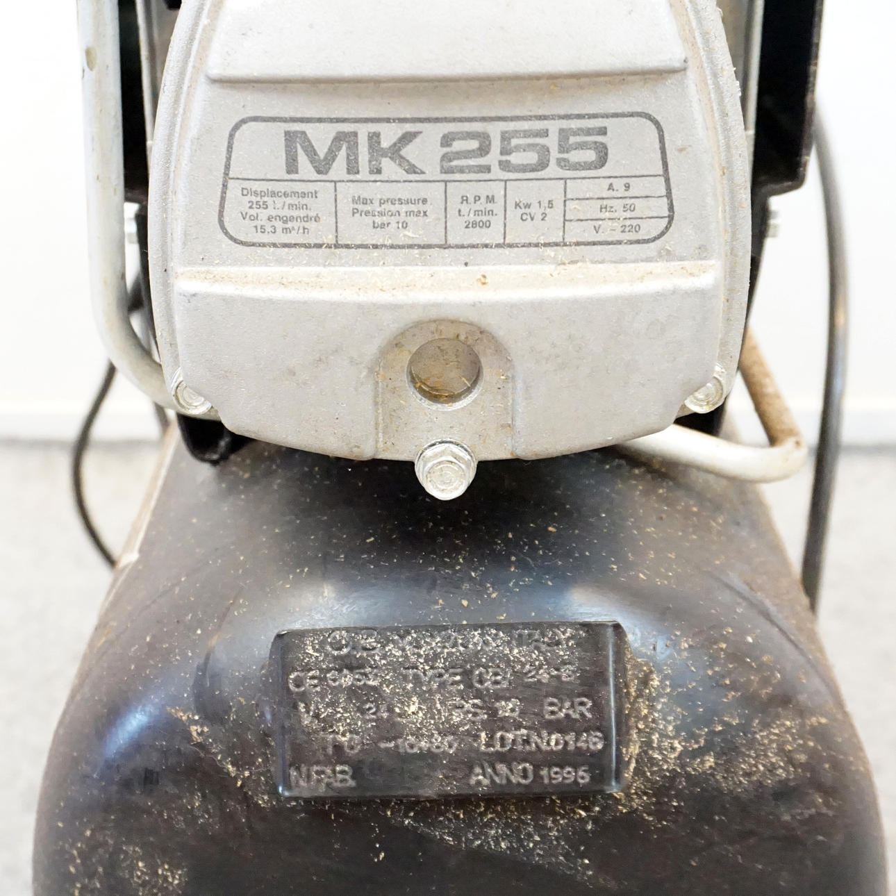 1996, Tank: 24 liters, Bar 10.0 RPM: 2800 On wheel stand with handle Length approx. 69 cm, height approx. 61 cm, width approx. 32 cm.