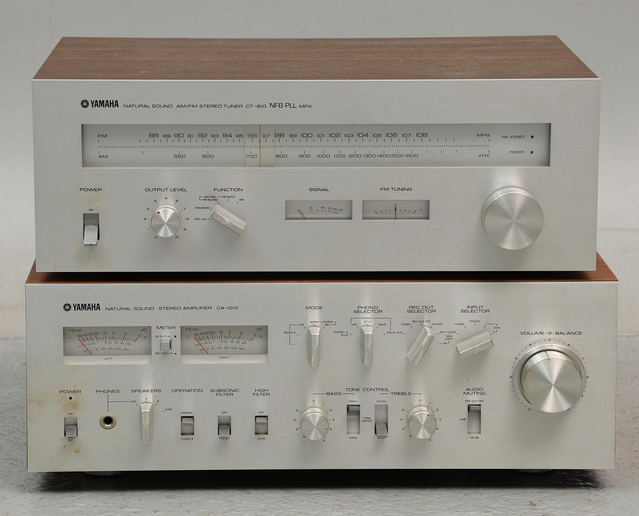 Yamaha Natural Sound Stereo Amplifier CA-1010, integrated amplifier, dimensions approx. 46x37x15 cm Yamaha Natural Sound AM/FM Stereo Tuner, CT-610 NFB PLL MPX, dimensions approx. 43.5x30x15 cm.
