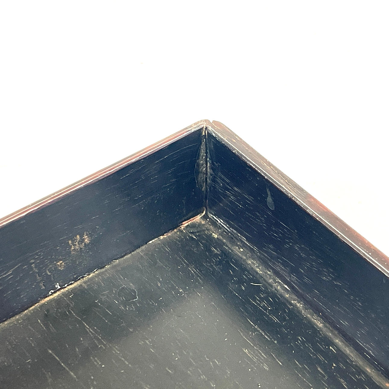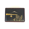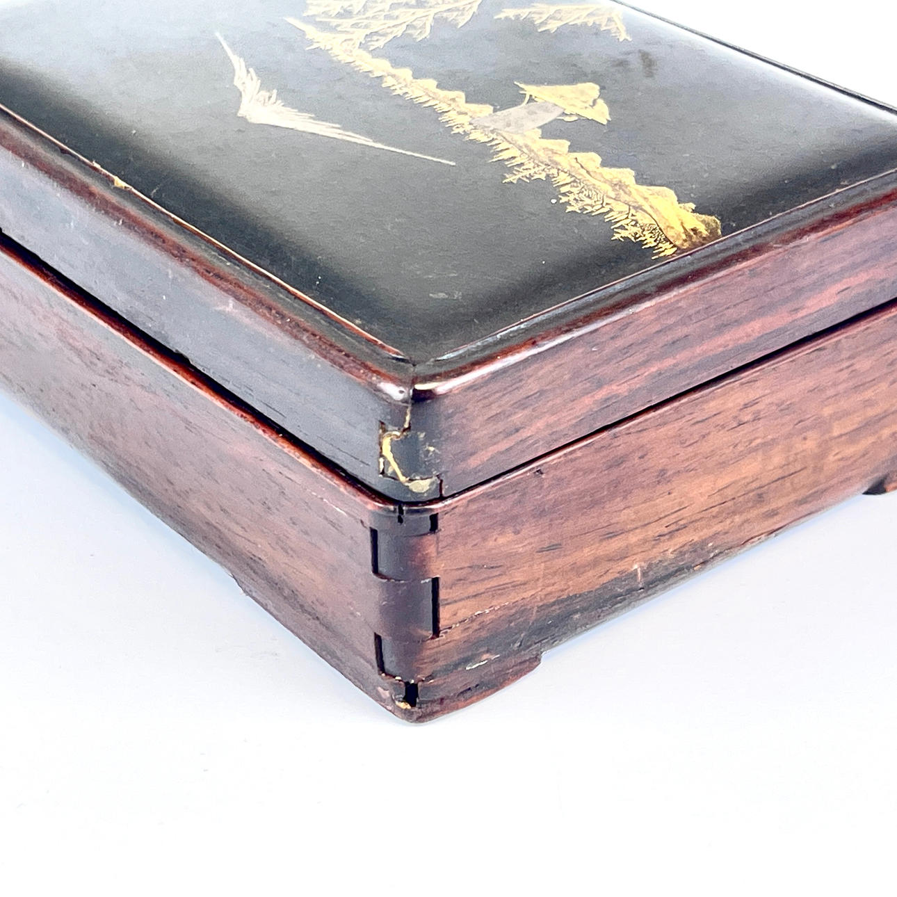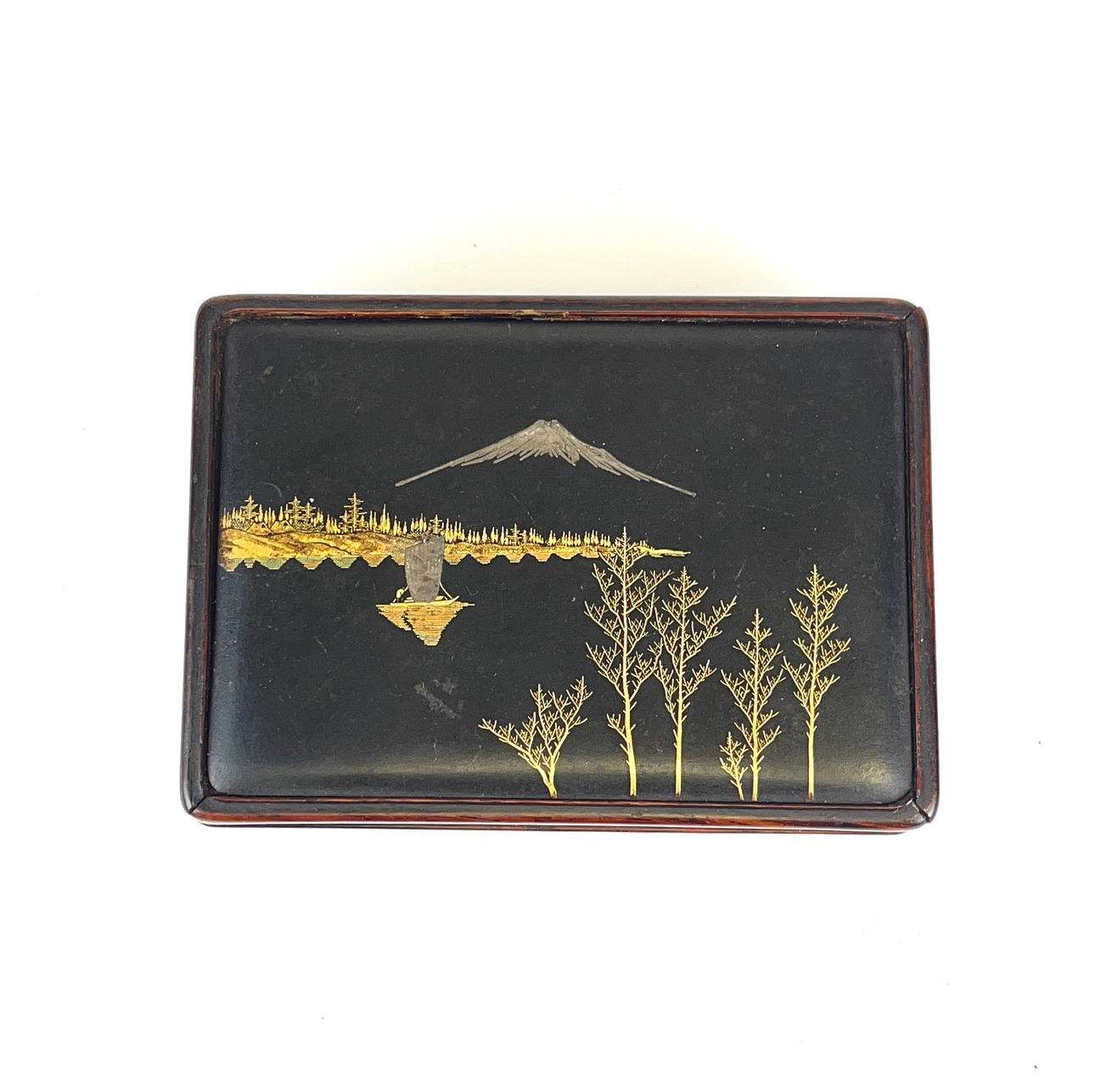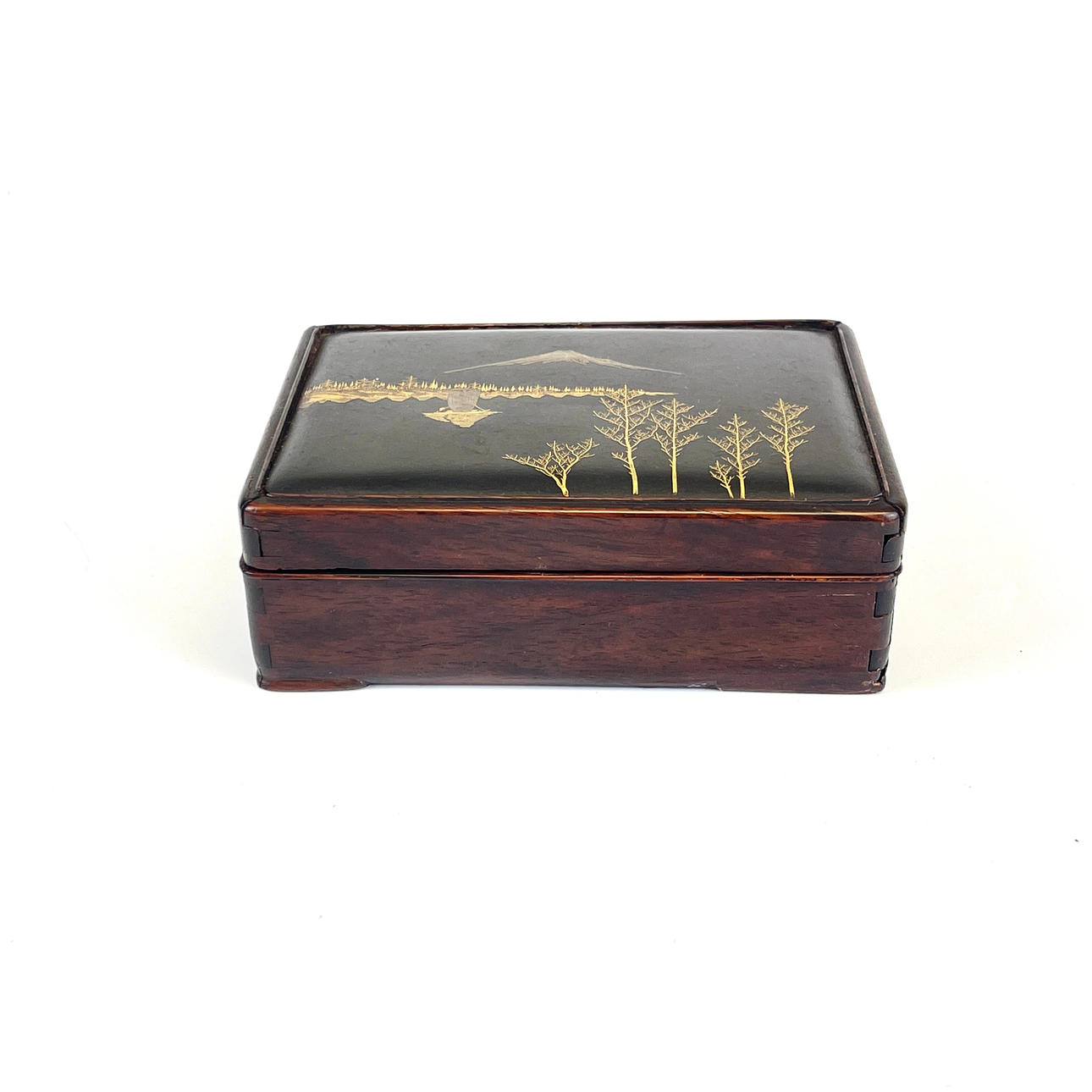 A Japanese hardwood cigarette box inset with a silvered and gilt bronze panel depicting Mount Fuji, 14.4 x 10.5 x 5cm.