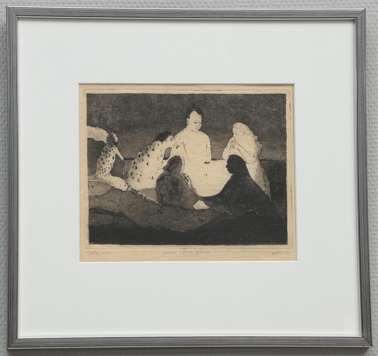 OUTI HEISKANEN. Etching, "Guests from afar", signed Heis, dated -83, numbered 16/70.