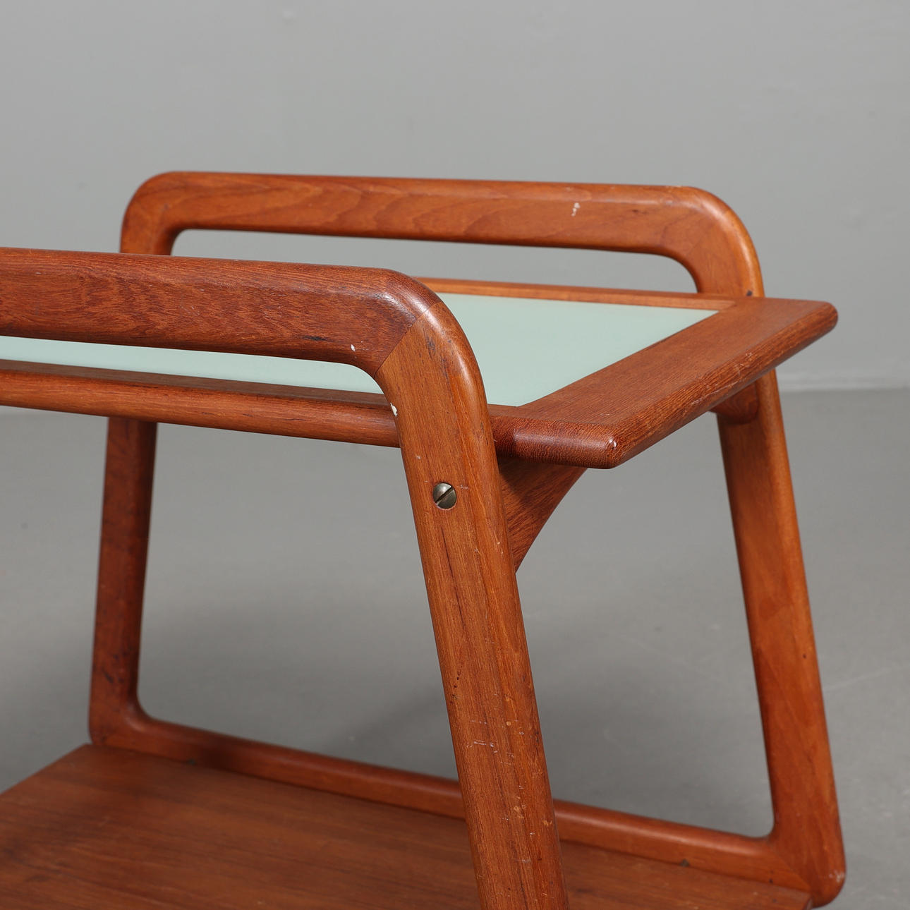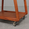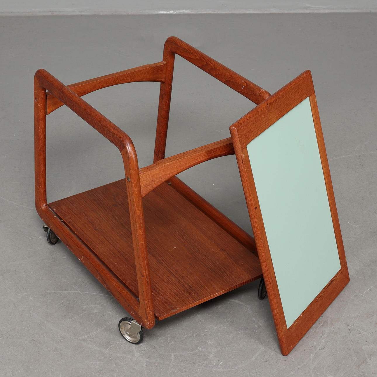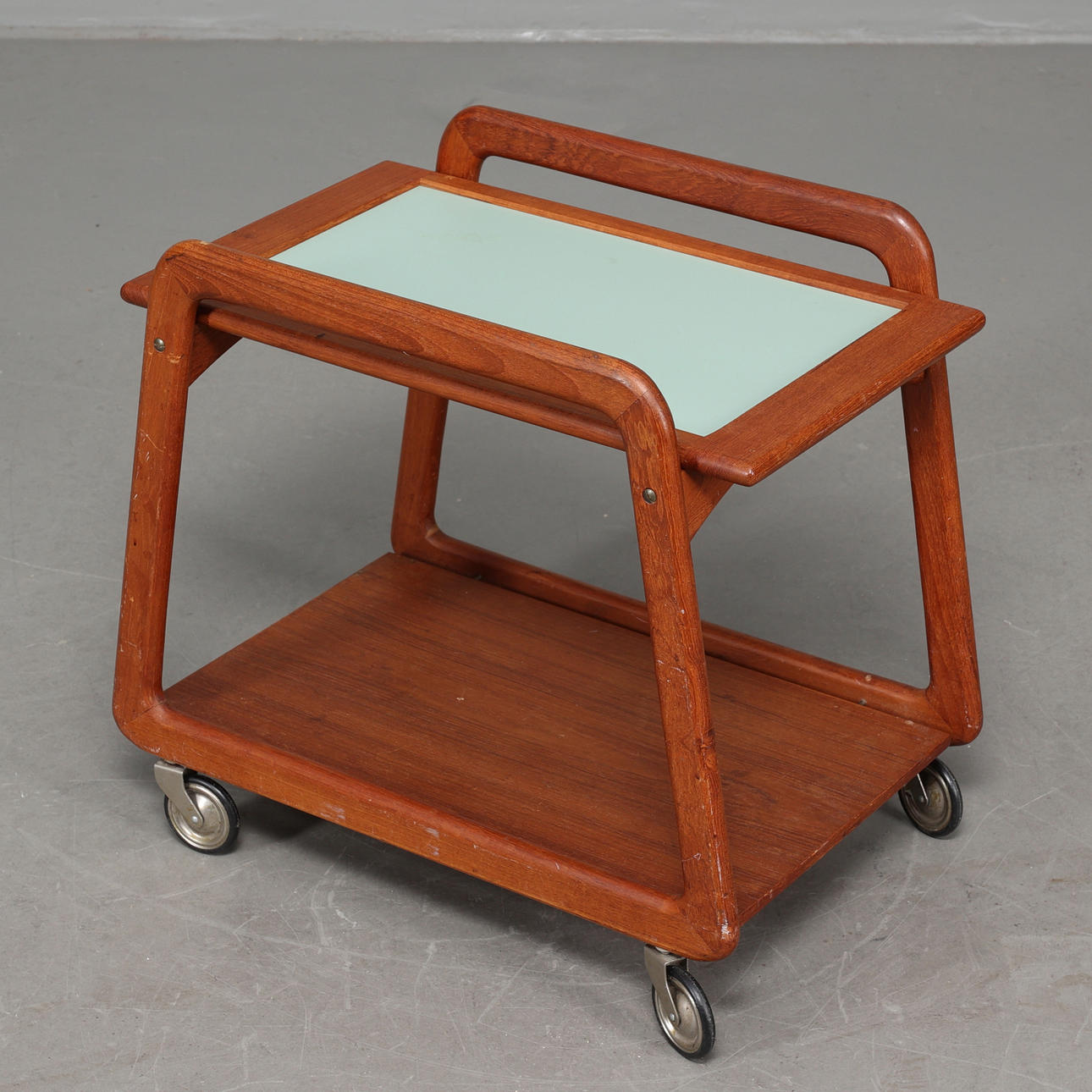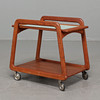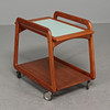 Serving trolley with solid teak frame on wheels. Loose tray laminated. Dimensions: length 62, width 41, height 56 cm.