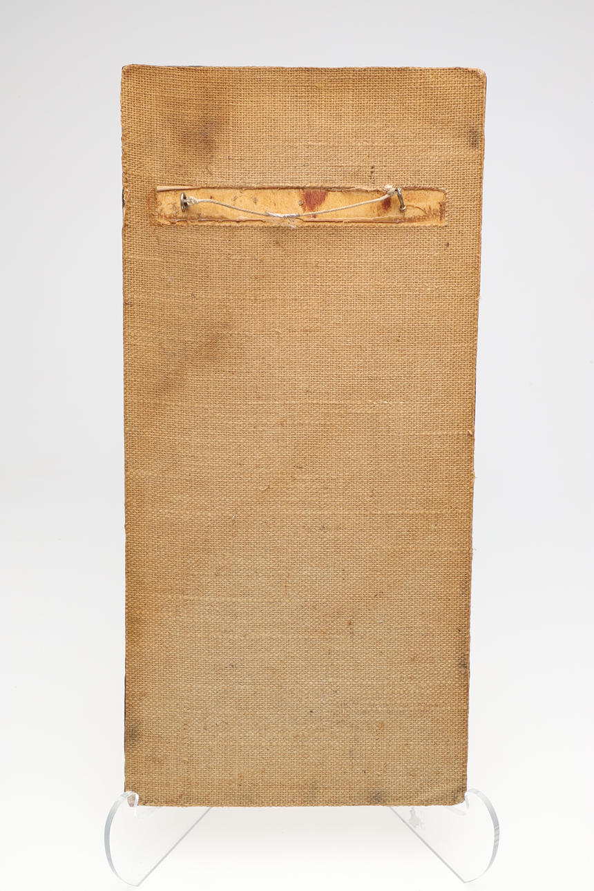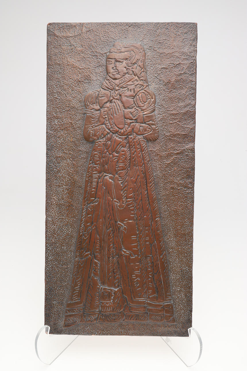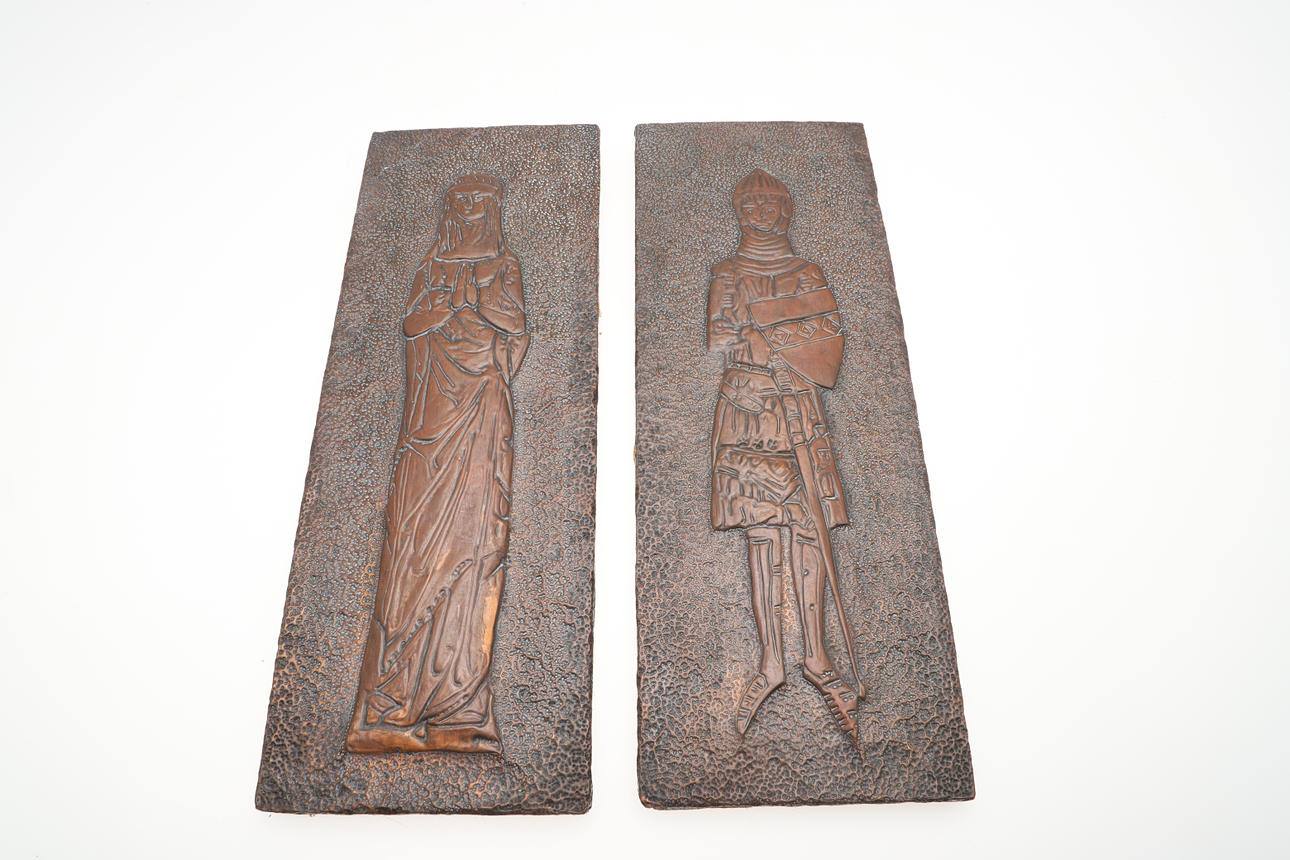 All can be wall hung, the larger plaque depicting a woman in prayer, as is a smaller one, along with a knight holding a sword and shield. Appear to be stamped and filled. Large plaque; 56cm x 27cm.