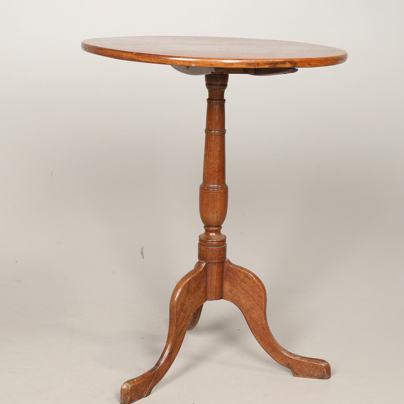 The mahogany circular tilt-top on a turned walnut column and tripod base.