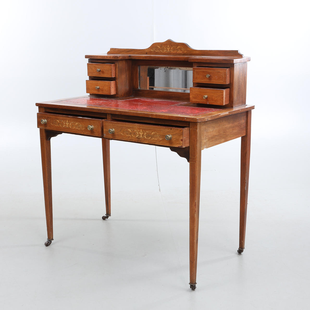 On casters, 2 underlying drawers with leather-covered writing board. Overhead part with mirror and 4 drawers. Crown and drawer fronts with intarsia decoration. Length approx. 91, width 48, height 102 cm.