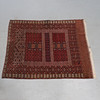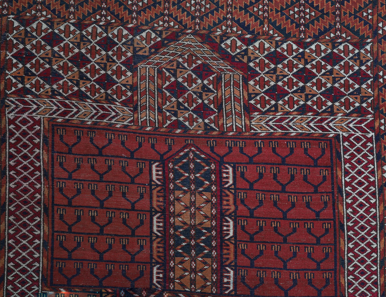 the mirab divided into compartments, within a wide border of repeated lozenges, on a rust ground, 173cm X 123Ccm.