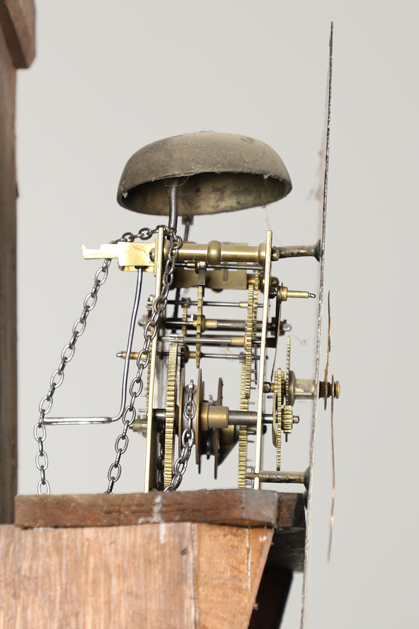 A 30 HOUR OAK LONGCASE CLOCK.