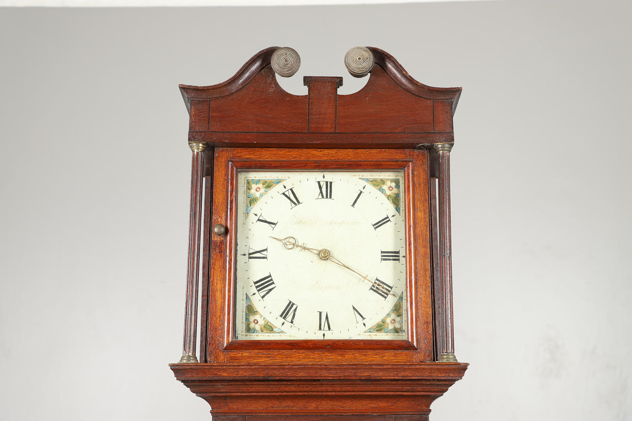 With a painted dial bearing the name Tho Shakespeare, Burton. with a key, pendulum and single weight height 202cm.