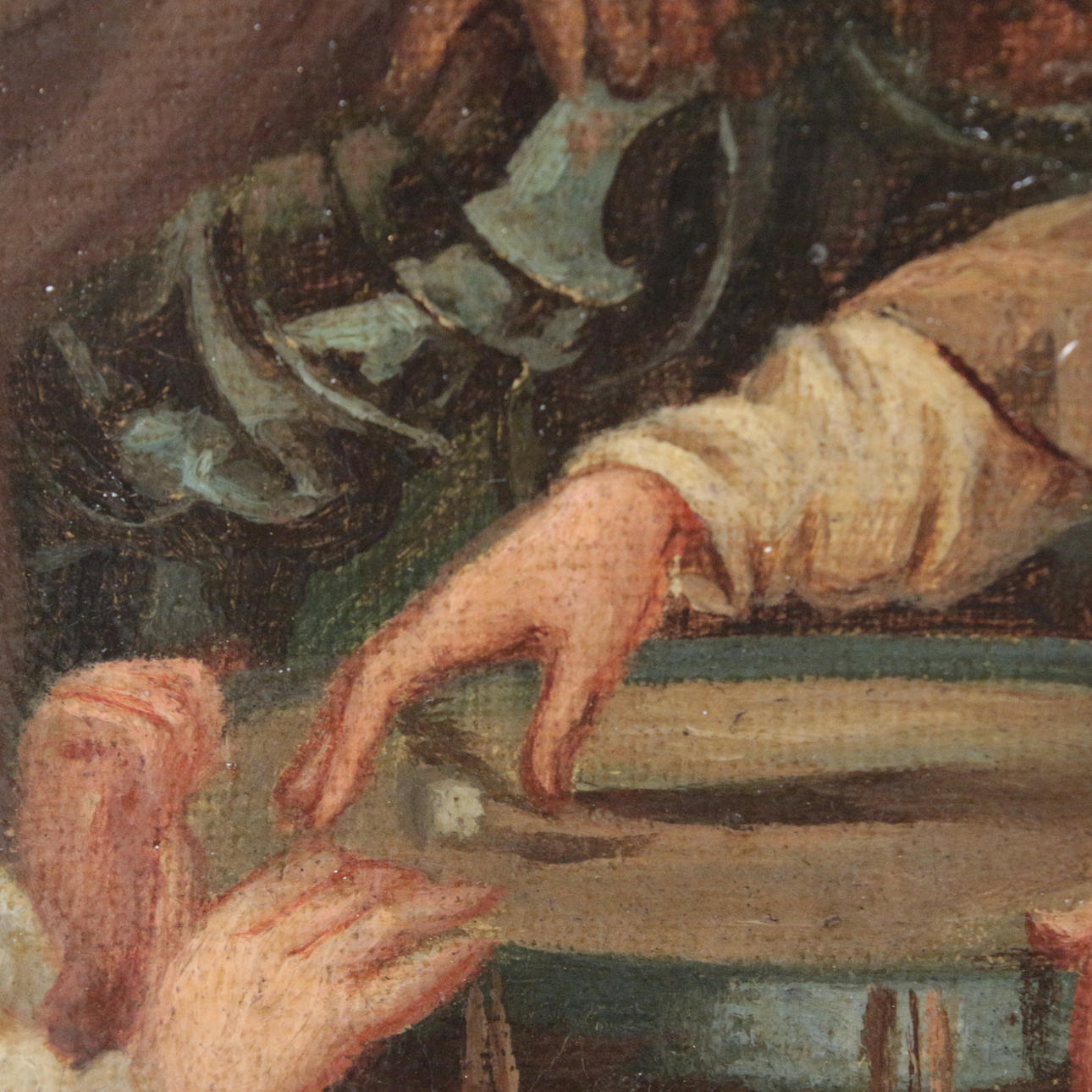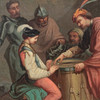 Age-related condition, color rubbed in places, craquelure in places, frame bumped in places.