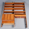 Peter Petrides, Shelf / wall shelf, teak, 1970s, Germany. Wall shelf made of glazed teak veneer with nine shelves, a lockable body with two folding doors and a desk with two drawers, H.225cm, W.170cm, D.20-45cm.