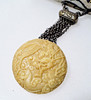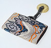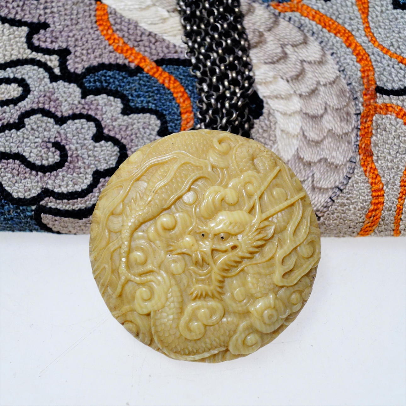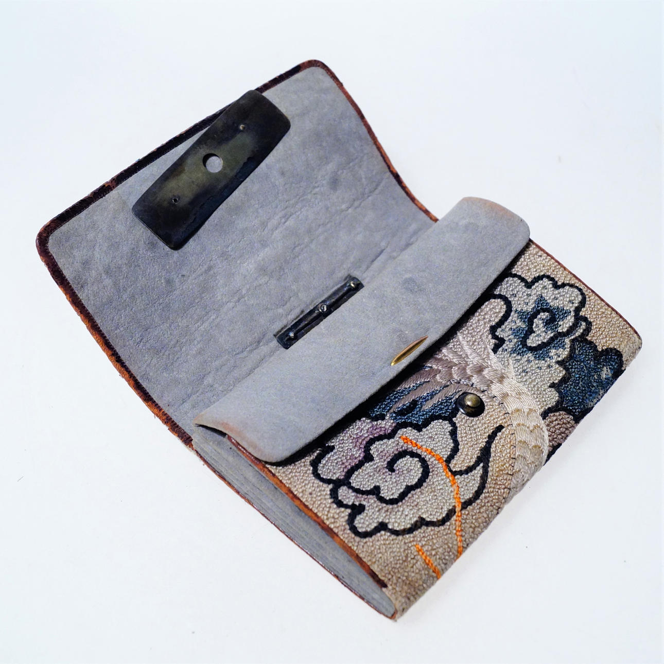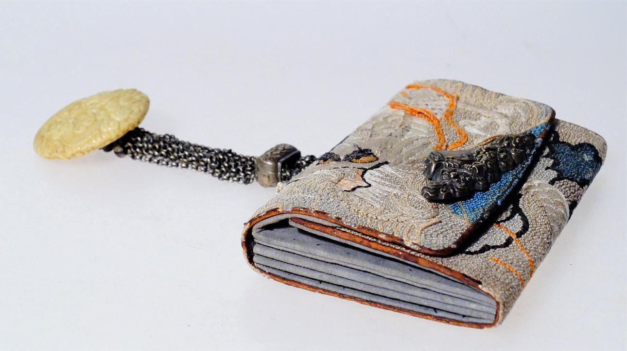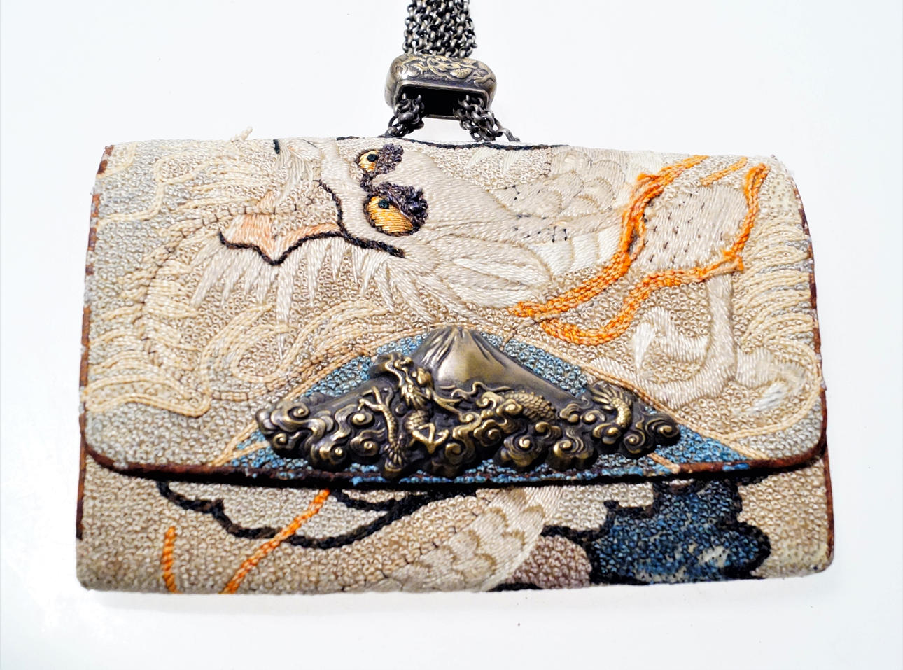 Dragon motif. Embroidered leather with Fuji in buckle and Netsuke attached to metal chain. Bag size 14 x 9 x 2.5 cm, diameter Netsuke 5 cm.