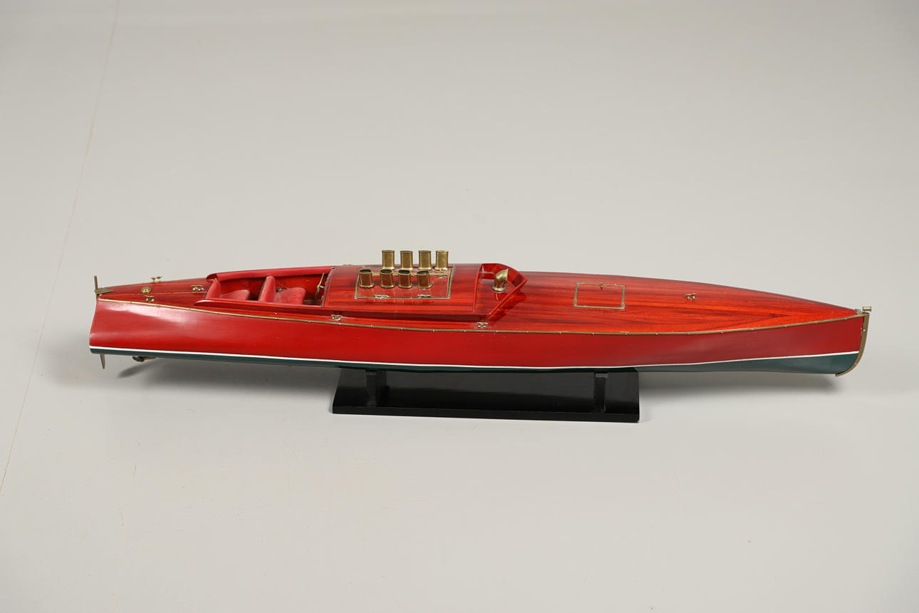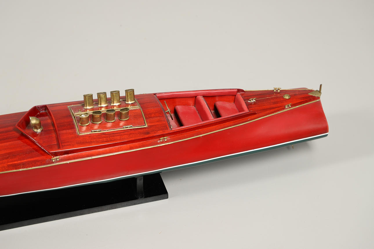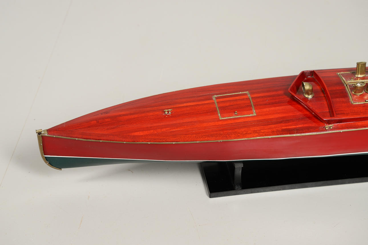 Of wood and resin construction, coloured red and green with brass detailing. Sits on a display stand, no inner workings. Length 100cm.