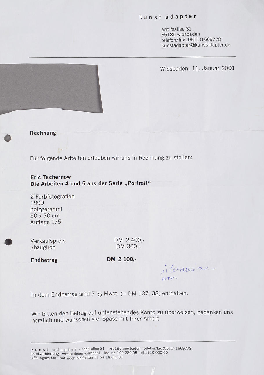 2922822. ERIC TSCHERNOW. "Portrait, Work No. 5". Photography, lambda deduction. Dating 1999.
