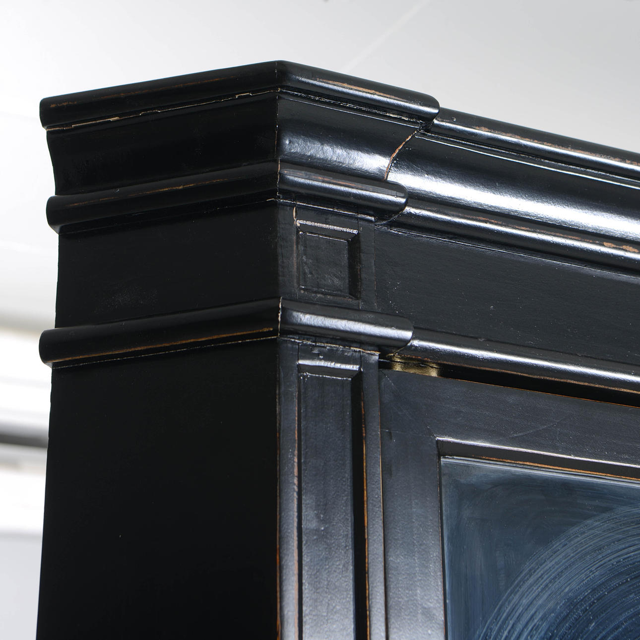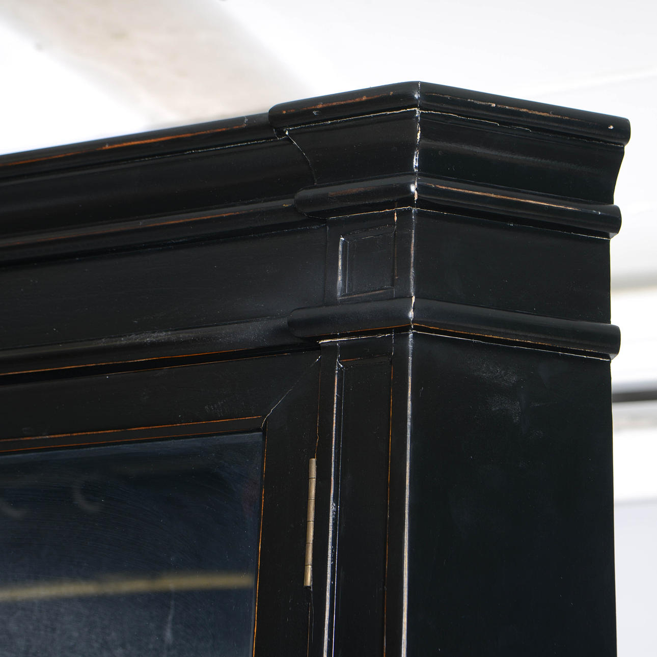 Painted black. Two-piece. Upper part with slatted glass door. Height 220 cm. Depth 60 cm. Width approx. 90 cm.