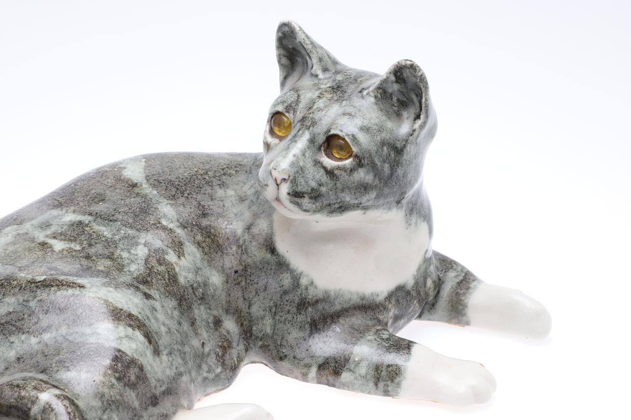 2928725. A LARGE WINSTANLEY POTTERY STRIPED GREY/GREEN CAT.
