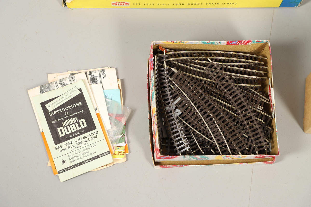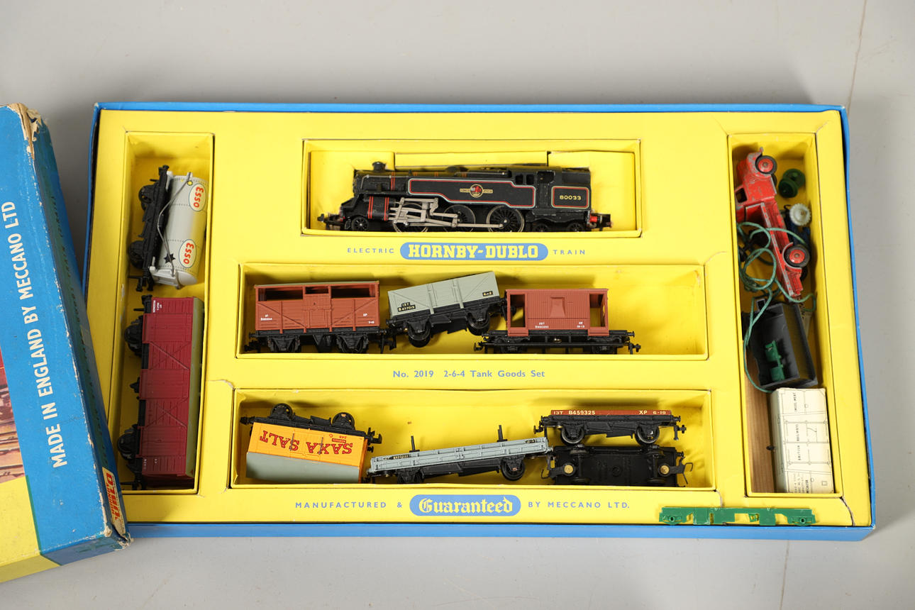 Two boxed Train sets including Set 2021 'The Red Dragon Passenger Train' including Cardiff Castle 4075 (no track), and Set 2019 '2-6-4 tank goods train' (no track but extra wagons). Also with R61 Hornby Signal Box, 5051 Dublo Signal, P42 Power Unit, and accessories.