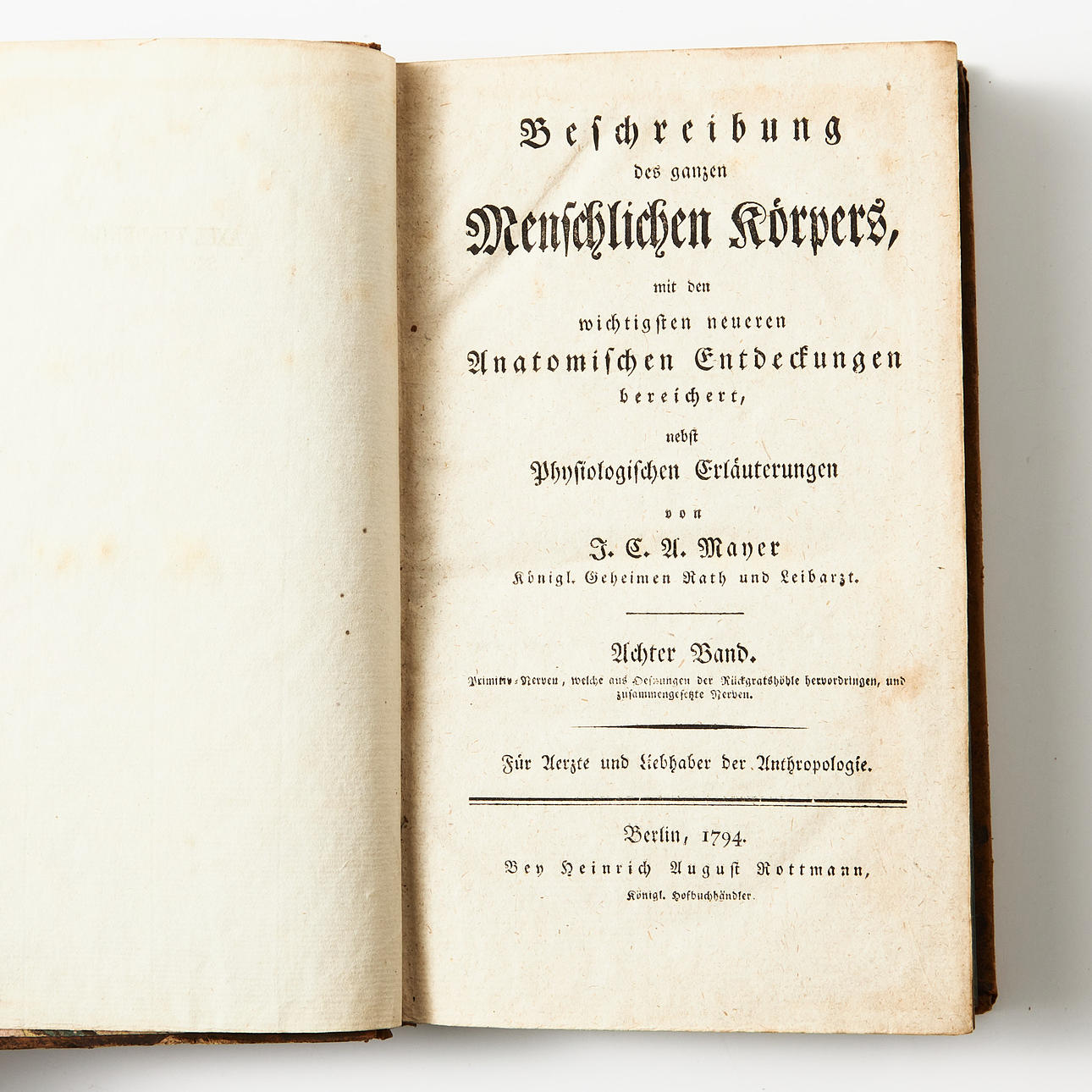 MAYER, JOHANN CHRISTOPH ANDREAS. Beschreibung des ganzen menschlichen Körpers, mit den wichtigsten neuer anatomischen Entdeckungen bereichert, nebst physiologischen Erläuterungen von J. C. A. Mayer. I-VIII. Berlin und Leipzig, bey George Jacob Decker, 1783-88/bey Heinrich August Rottmann, 1794.