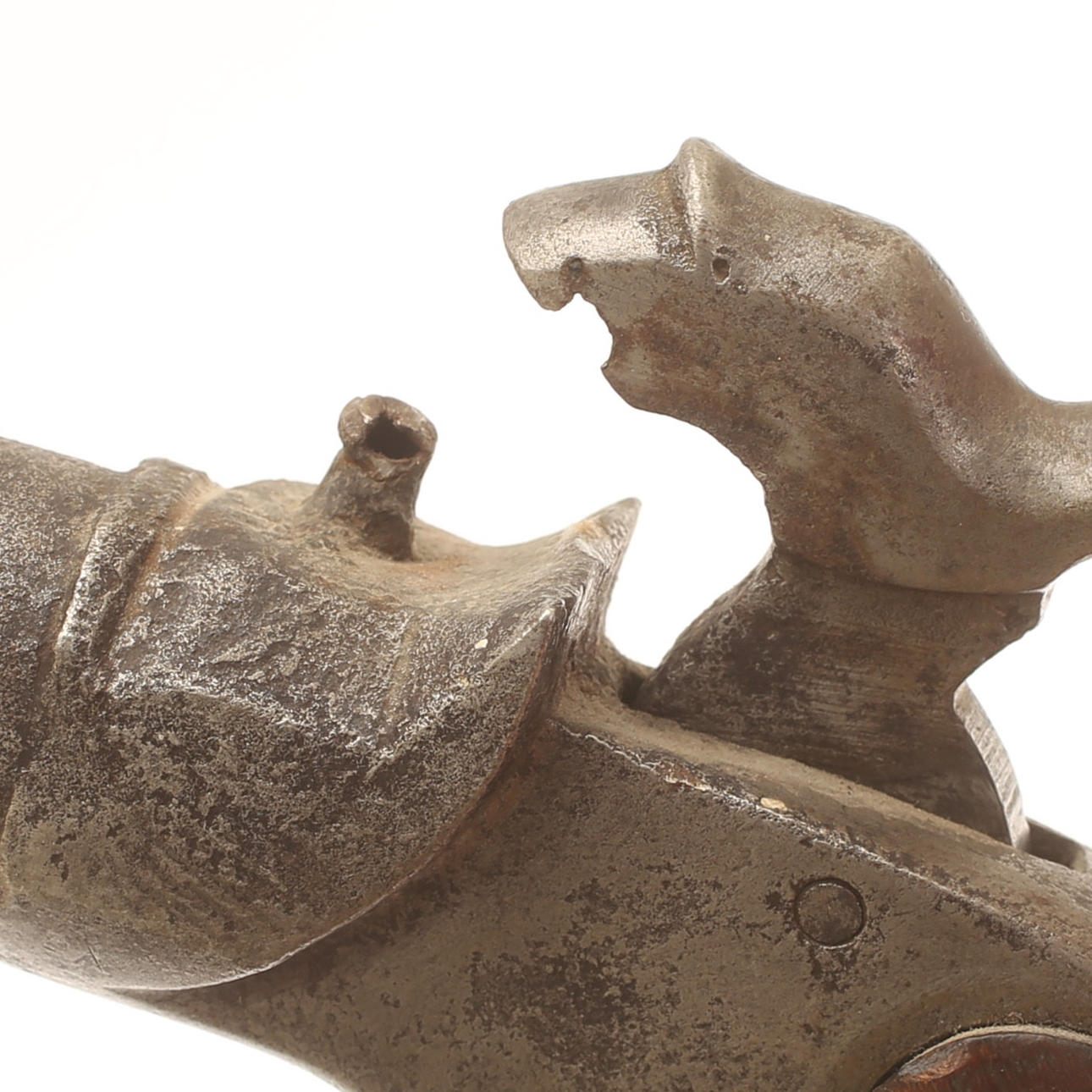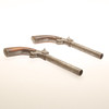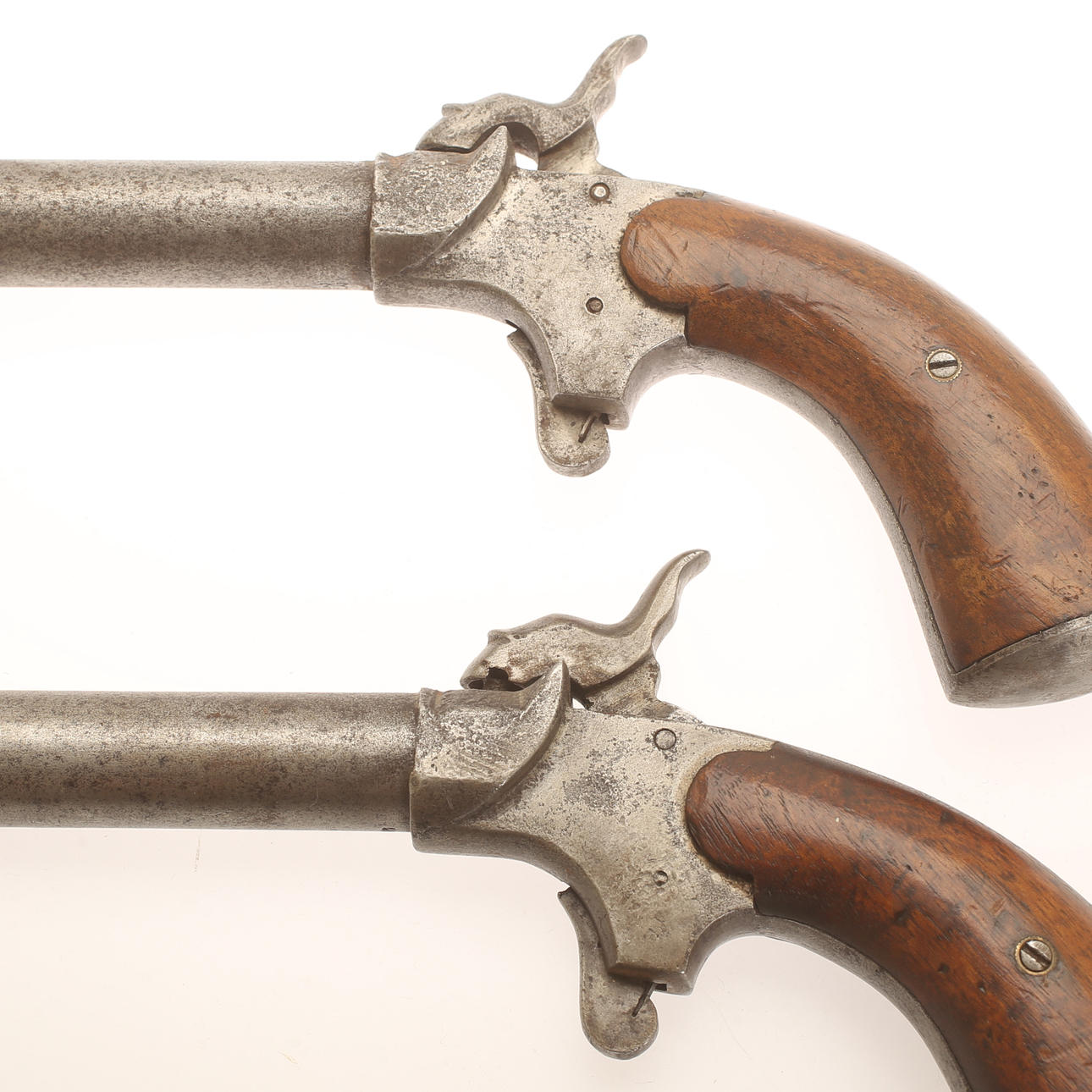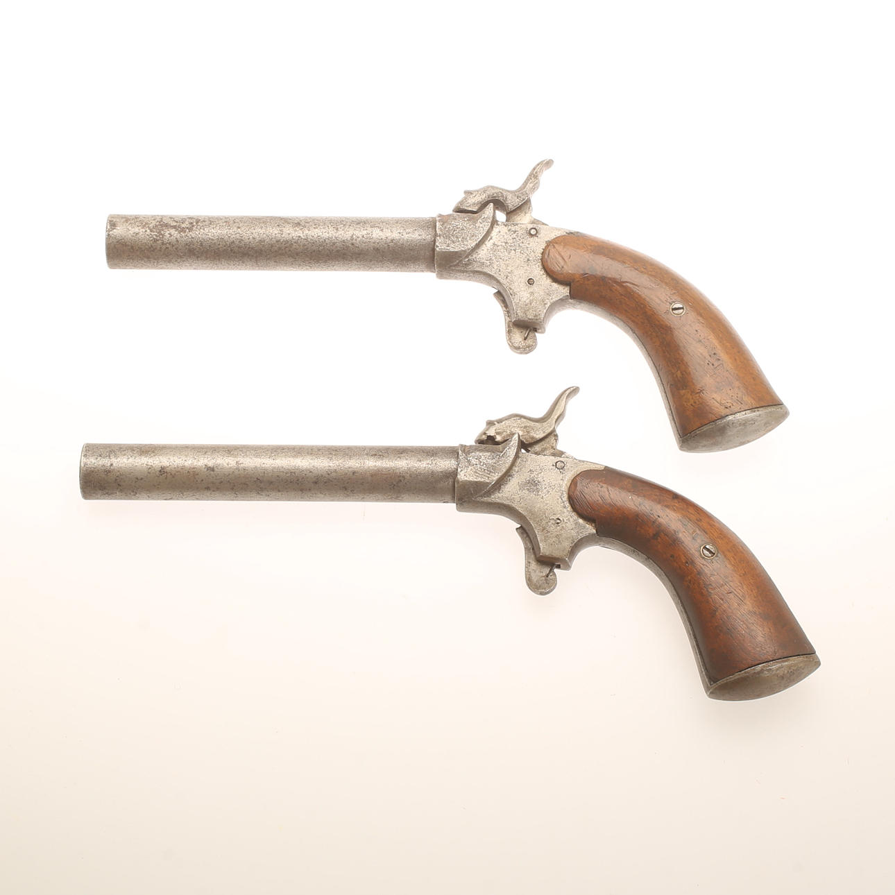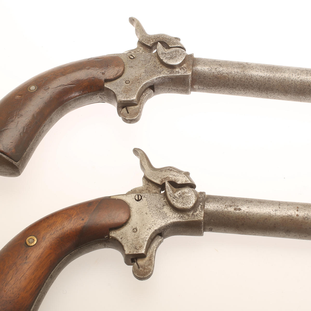 Large boot pistols in pairs, caliber approx. 17mm. Working mechanism. Butt sides in walnut. Probably German, second half of the 19th century.
