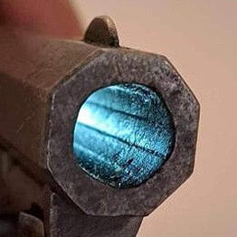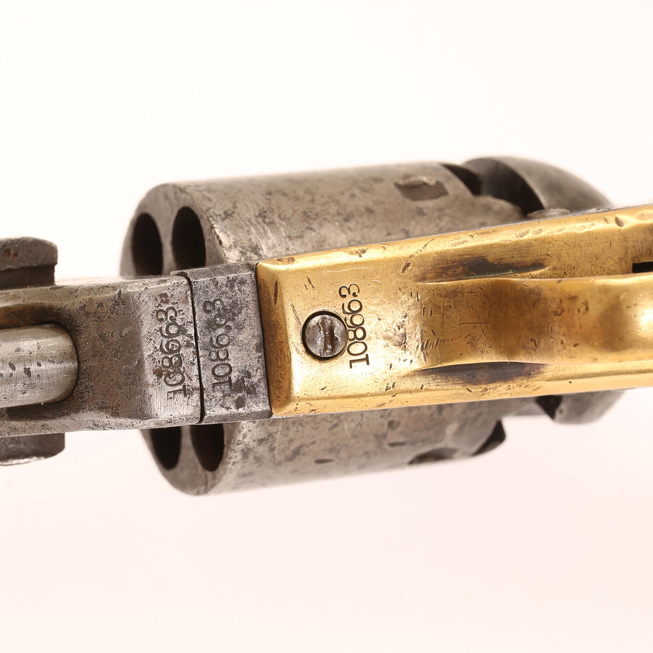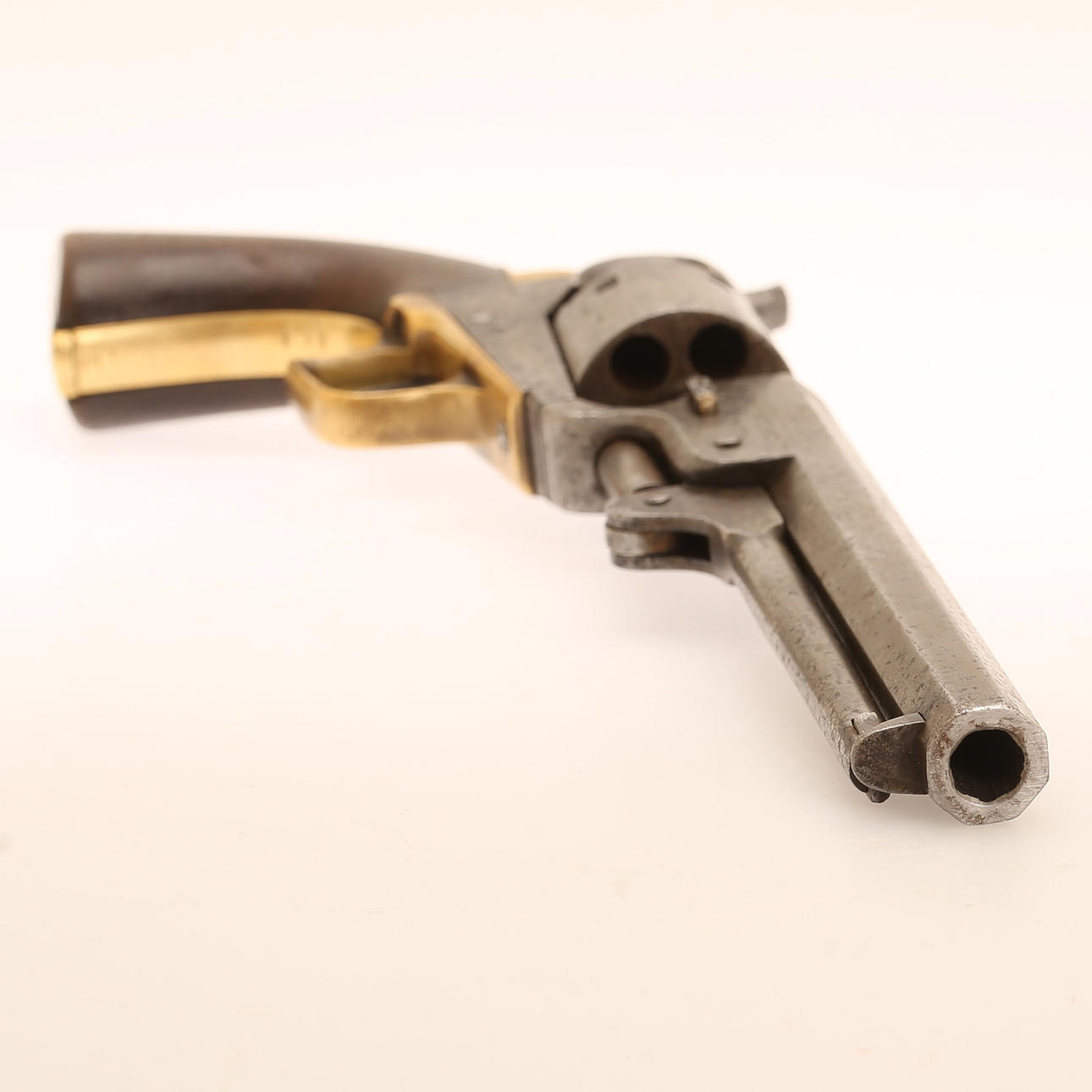 Percussion revolver Colt 1851 navy model. With squareback stay bar, probably special ordered with this stay bar. Serial no. 108663 Transitional gray surface with black spots. True to number, except pipe wedge. Clear barrel address.