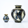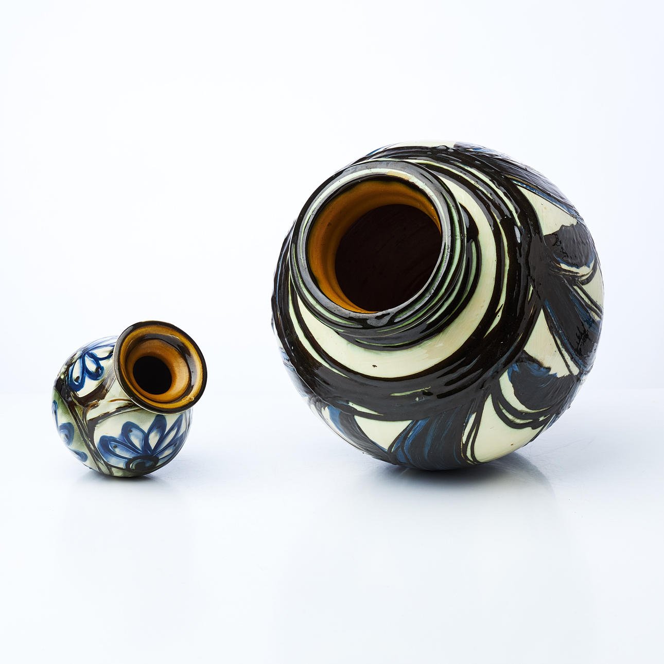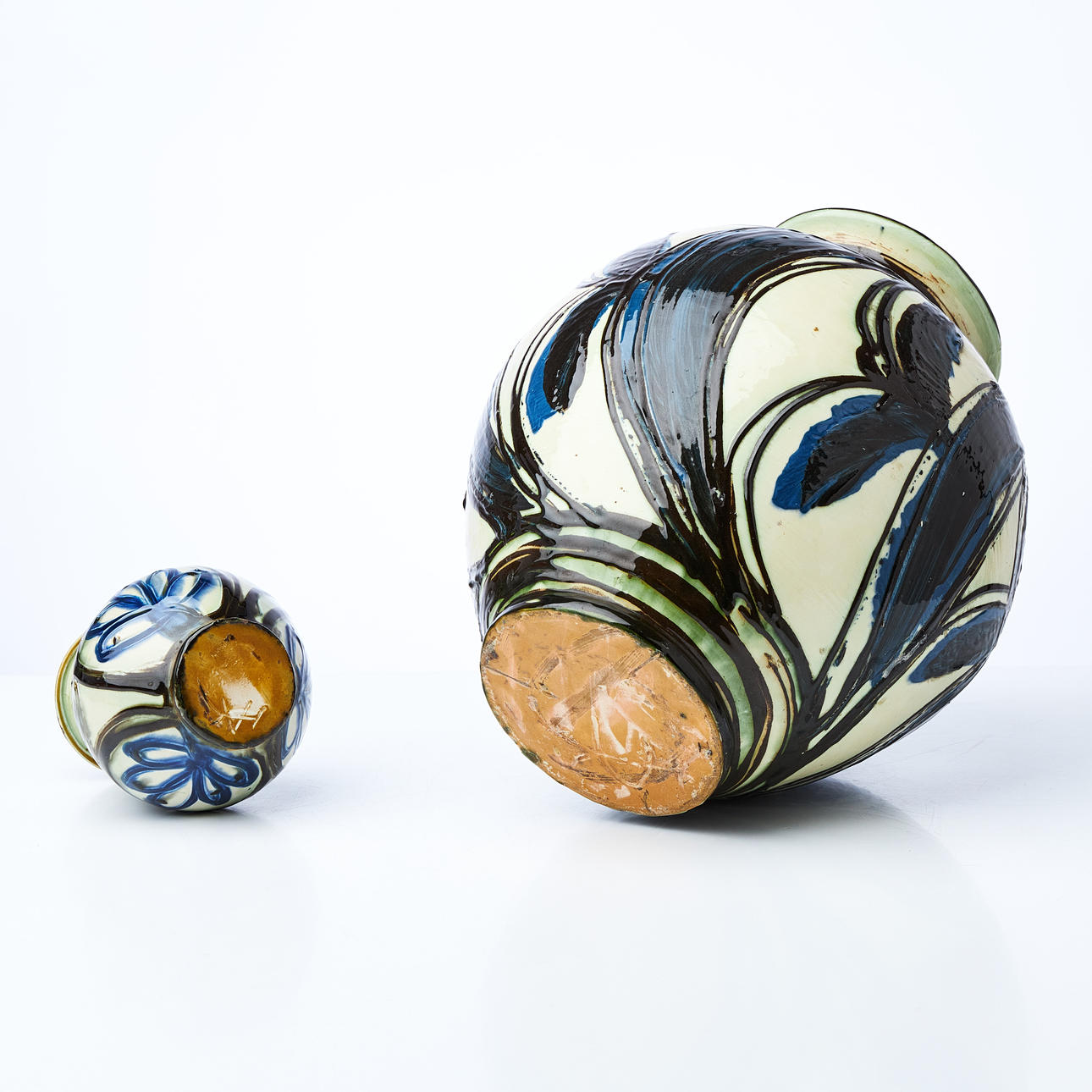 The larger one with a Chips on the foot ring and surface dirt. The smaller one with a smaller Chips at the top.
