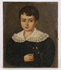 Portrait of a boy, half length, with pleated lace collar, holding a small bunch of wild flowers, oil on canvas, unframed 38cm x 46cm.