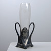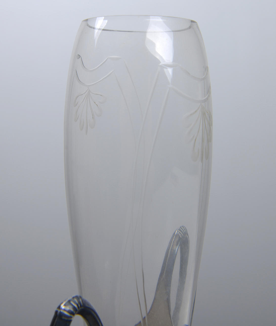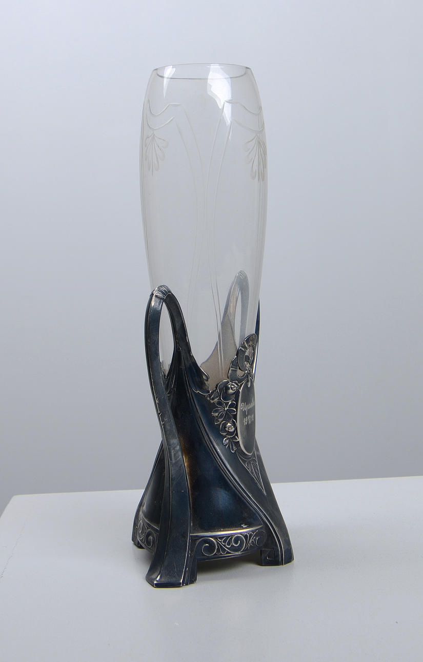 Vase with stand in nickel silver and vase in glass with etched decoration. Height 26 cm.