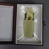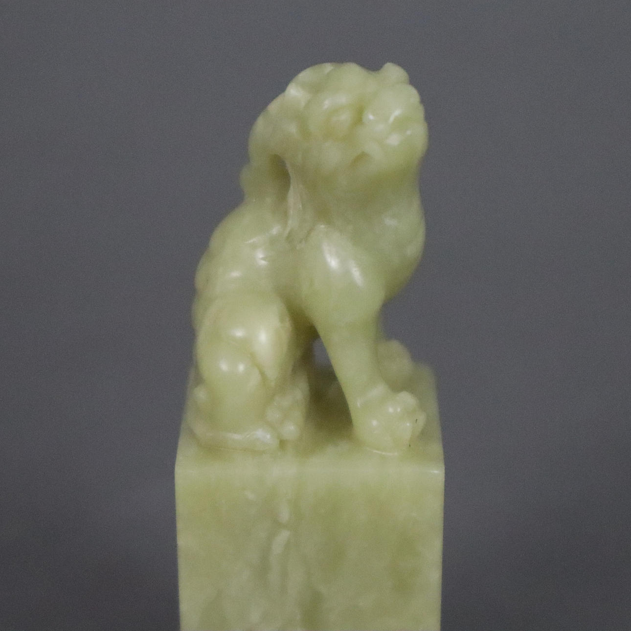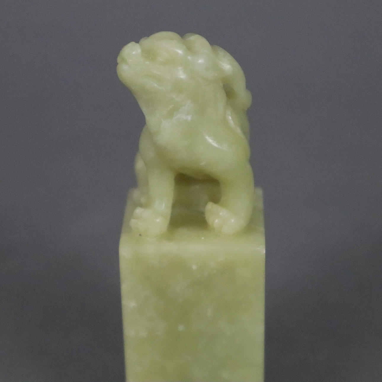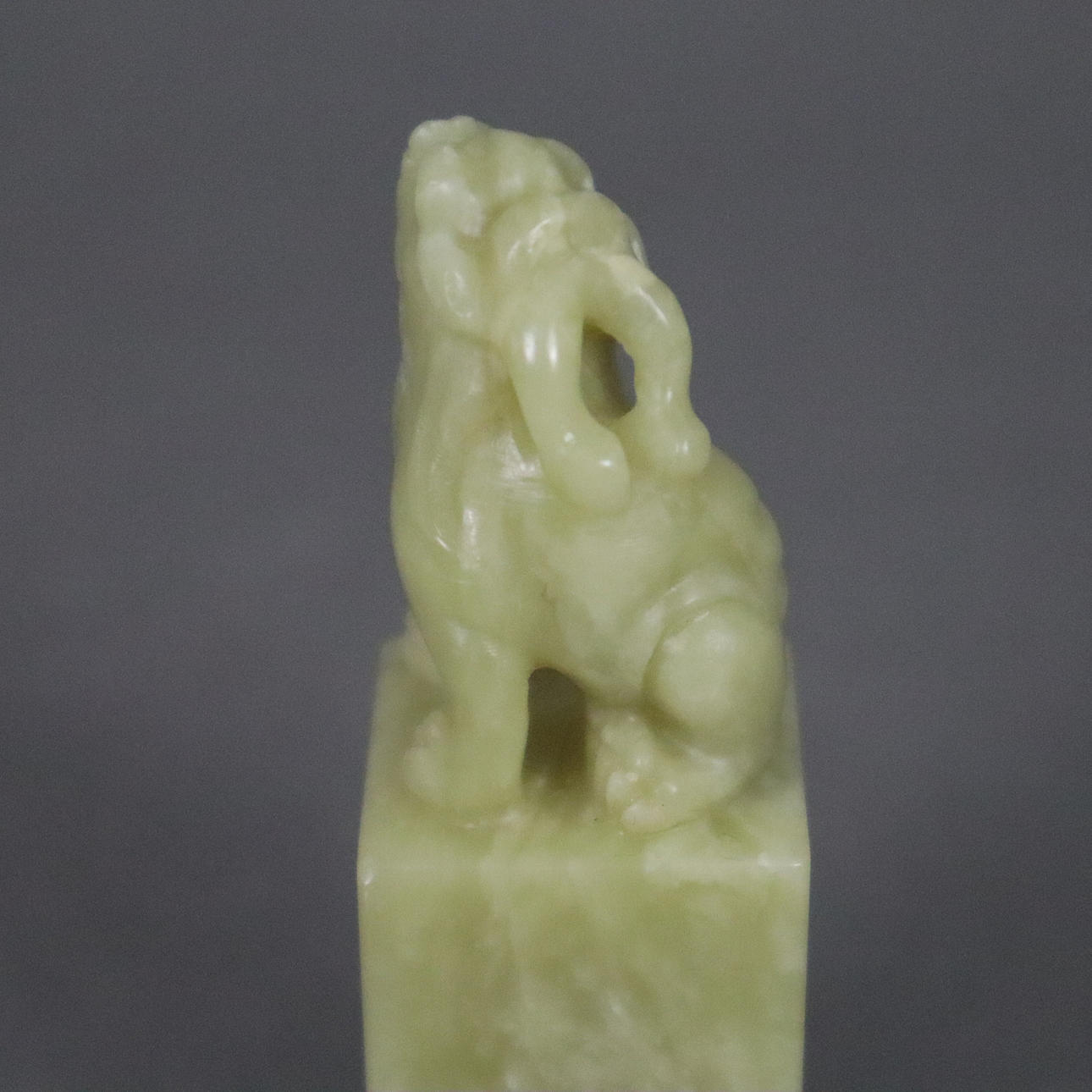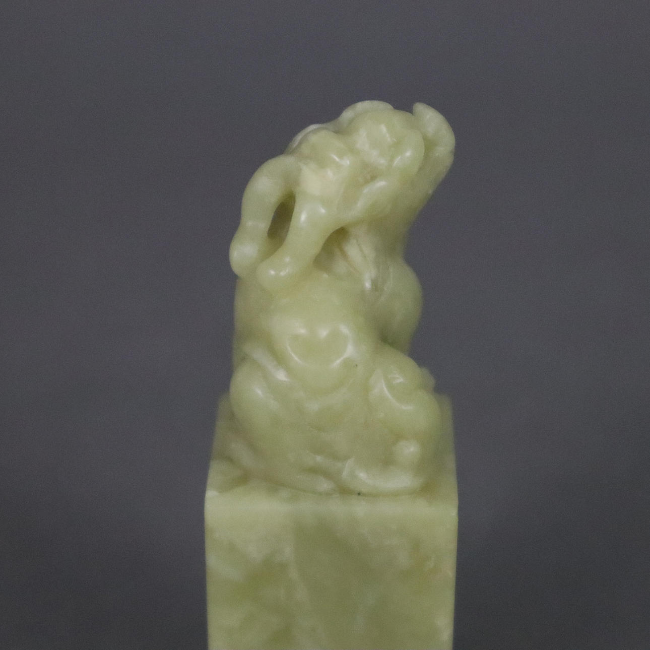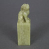finely grained celadon-colored Qingtian stone, oblong cuboid crowned with a fully round figure of a sitting Qilin, free sealing field, 8.2 x 2.5 x 2.5 cm, weight approx. 115g.