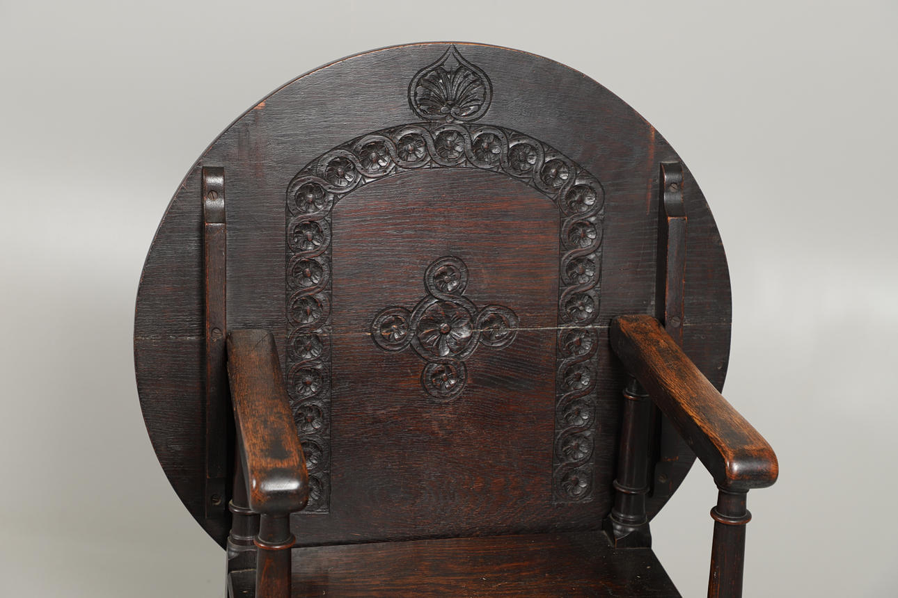 With turned supports and carved floral roundel decoration. Metamorphic back can be moved to create a top surface. Seat height 46cm, Total height 102cm. Diameter of back/top surface 70cm.