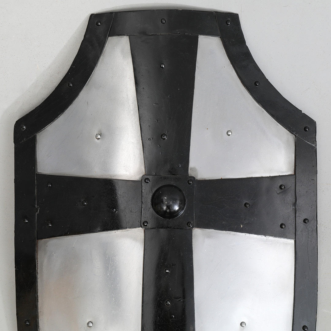 Handmade replica of a medieval gothic shield.. Height approx. 81cm, width approx. 44cm.